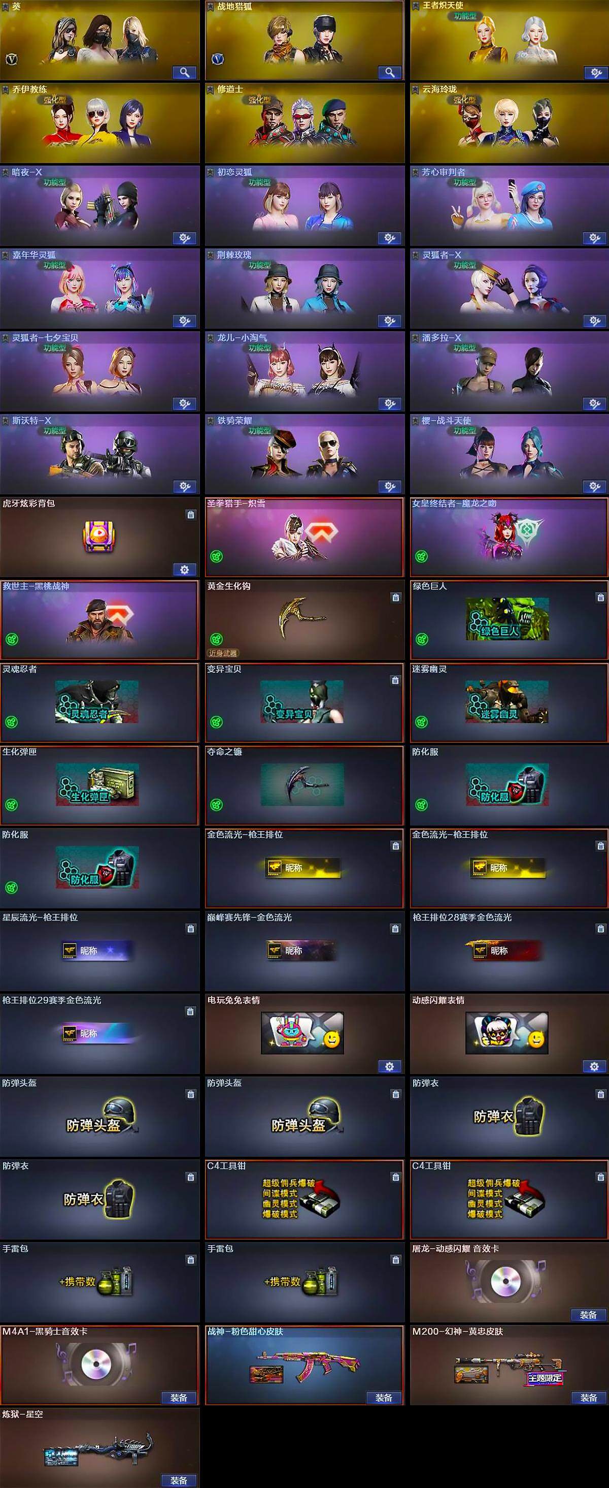 【道具】:虎牙炫彩背包,圣拳猎手-炽雪,女皇终结者-魔龙之吻,救世主-黑桃战神,黄金生化钩,绿色巨人,灵魂忍者,变异宝贝,迷雾幽灵,生化弹匣,夺命之镰,防化服*2,金色流光-枪王排位*2,星辰流光-枪王排位,巅峰赛先锋-金色流光,枪王排位28赛季金色流光,枪王排位29赛季金色流光,电玩兔兔表情,动感闪耀表情,防弹头盔*2,防弹衣*2,C4工具钳*2,手雷包*2