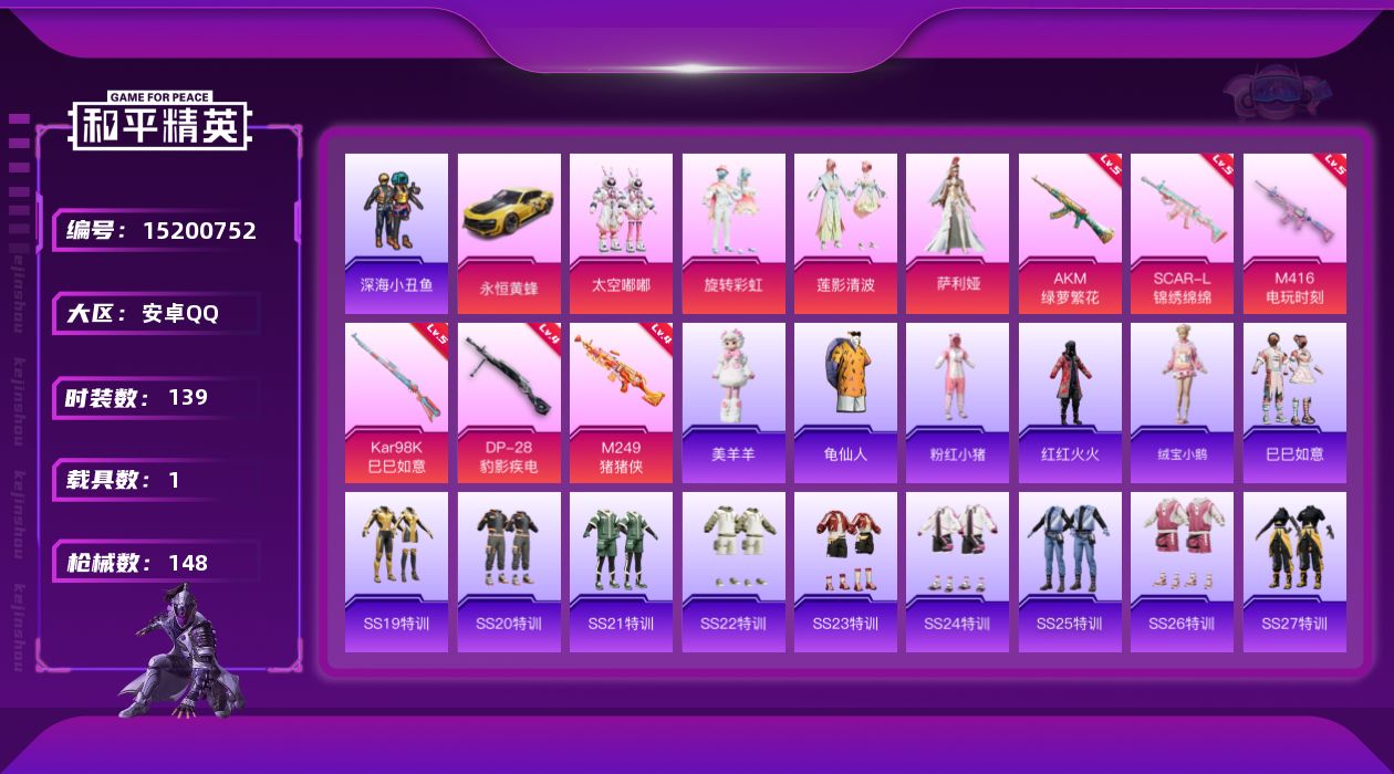 [15200752]可二次【店主推荐捡漏号!可直接换绑】 安卓 手Q-4粉装-6特效枪-1载具-0粉色飞行器-4.4w热力值-10王牌印记-139套装-148枪皮【热门品类】:套装-深海小丑鱼,套装-龟仙人,套装-粉红小猪,套装-红红火火【粉色载具】:永恒黄蜂【粉色套装】:粉装-太空嘟嘟,粉装-旋转彩虹,粉装-莲影清波,角色-萨利娅【粉色枪皮等级】:AKM-绿萝繁花(五级),SCAR-L-锦绣绵绵(五级),M416-电玩时刻(五级),Kar98K-巳巳如意(五级),M249-猪猪侠(四级),DP-28-豹影疾电(四级)