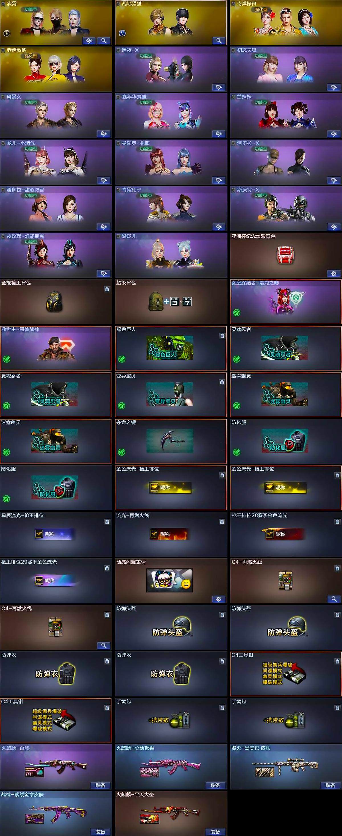 【道具】:亚洲杯纪念炫彩背包,全能枪王背包,超级背包,女皇终结者-魔龙之吻,救世主-黑桃战神,绿色巨人,灵魂忍者*2,变异宝贝,迷雾幽灵*2,夺命之镰,防化服*2,金色流光-枪王排位*2,星辰流光-枪王排位,流光-再燃火线,枪王排位28赛季金色流光,枪王排位29赛季金色流光,动感闪耀表情,C4-再燃火线*2,防弹头盔*2,防弹衣*2,C4工具钳*2,手雷包*2
