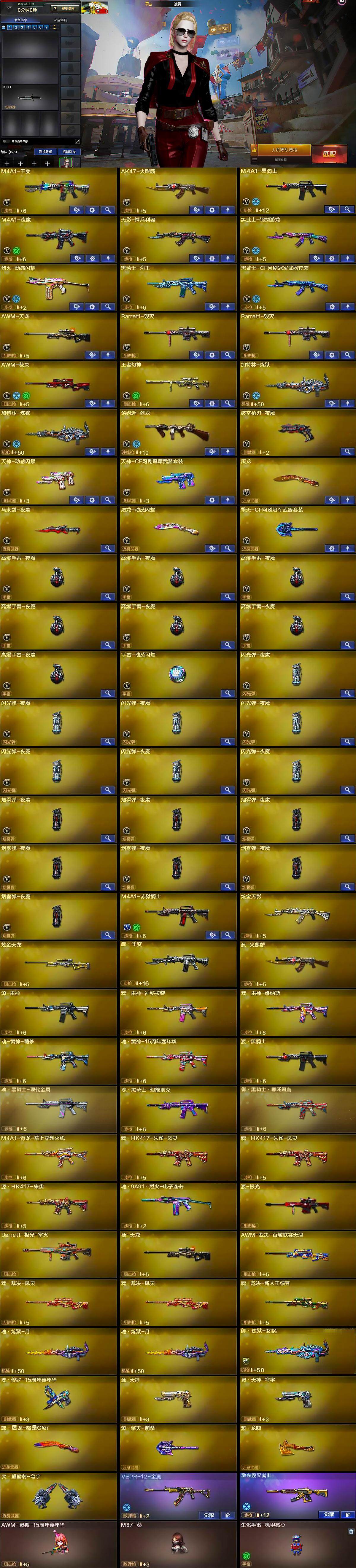 【英雄级武器】:M4A1-千变,AK47-火麒麟,M4A1-黑骑士,M4A1-夜魔,无影-神兵利器,黑武士-锦绣游龙,烈火-动感闪耀,黑骑士-海王,黑武士-CF网剧冠军,AWM-天龙,Barrett-毁灭*2,AWM-裁决,王者幻神-觉醒版,加特林-炼狱*2,汤姆逊-烈龙,破空枪刃-夜魔,天神-动感闪耀,天神-CF网剧冠军,屠龙,马来剑-夜魔,屠龙-动感闪耀,擎天-CF网剧冠军,高爆手雷-夜魔*7,手雷-动感闪耀,闪光弹-夜魔*7,烟雾弹-夜魔*7,M4A1-赤狱骑士