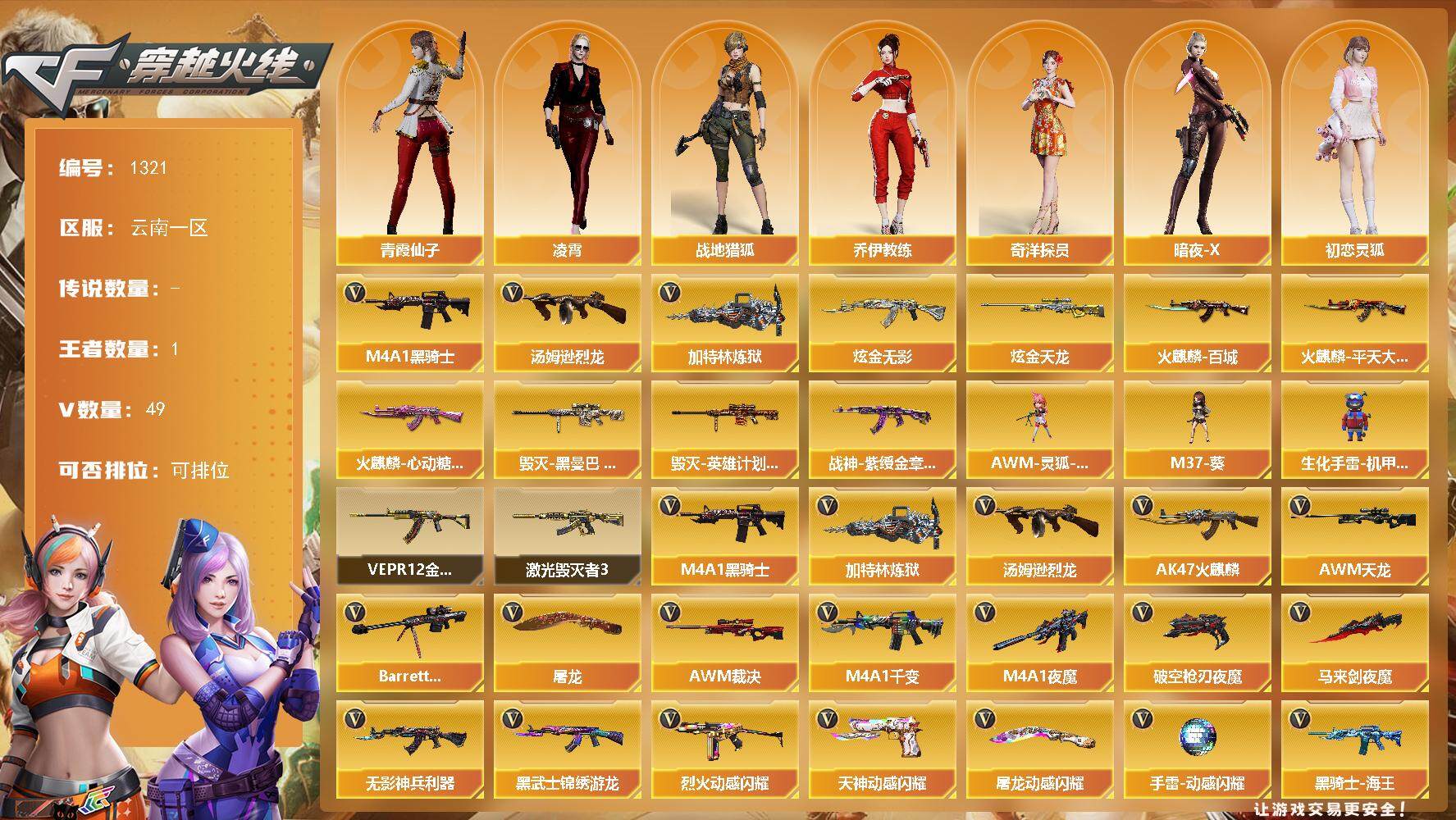 [15200961]云南一区-49V-1王者-2炫金 【热门武器】:M4A1-黑骑士,汤姆逊-烈龙,加特林-炼狱*2 【王者炫金武器】:炫金无影,炫金天龙 【皮肤】:火麒麟-平天大圣,火麒麟-百城,火麒麟-心动糖果,毁灭-黑曼巴 皮肤,毁灭-英雄计划 皮肤,战神-紫绶金章皮肤 【角色】:凌霄,战地猎狐,奇洋探员,乔伊教练,暗夜-X,初恋灵狐,风暴女,嘉年华灵狐,兰妹妹,龙儿-小淘气,曼陀罗-礼服,潘多拉-X,潘多拉-甜心教官,青霞仙子,斯沃特-X,兔囡囡,夜玫瑰-幻能朋克,游珑儿 【人偶武器】:AWM-灵狐-15周年嘉年华,M37-葵,生化手雷-机甲核心 【挑战大师】:VEPR-12-金魔,激光毁灭者III 【英雄级武器】:M4A1-千变,AK47-火麒麟,M4A1-黑骑士,M4A1-夜魔,无影-神兵利器,黑武士-锦绣游龙,烈火-动感闪耀,黑骑士-海王,黑武士-CF网剧冠军,AWM-天龙,Barrett-毁灭*2,AWM-裁决,王者幻神-觉醒版,加特林-炼狱*2,汤姆逊-烈龙,破空枪刃-夜魔,天神-动感闪耀,天神-CF网剧冠军,屠龙,马来剑-夜魔,屠龙-动感闪耀,擎天-CF网剧冠军,高爆手雷-夜魔*7,手雷-动感闪耀,闪光弹-夜魔*7,烟雾弹-夜魔*7,M4A1-赤狱骑士 【道具】:亚洲杯纪念炫彩背包,全能枪王背包,超级背包,女皇终结者-魔龙之吻,救世主-黑桃战神,绿色巨人,灵魂忍者*2,变异宝贝,迷雾幽灵*2,夺命之镰,防化服*2,金色流光-枪王排位*2,星辰流光-枪王排位,流光-再燃火线,枪王排位28赛季金色流光,枪王排位29赛季金色流光,动感闪耀表情,C4-再燃火线*2,防弹头盔*2,防弹衣*2,C4工具钳*2,手雷包*2 【特殊枪械】:1黑骑士,1烈龙,2炼狱