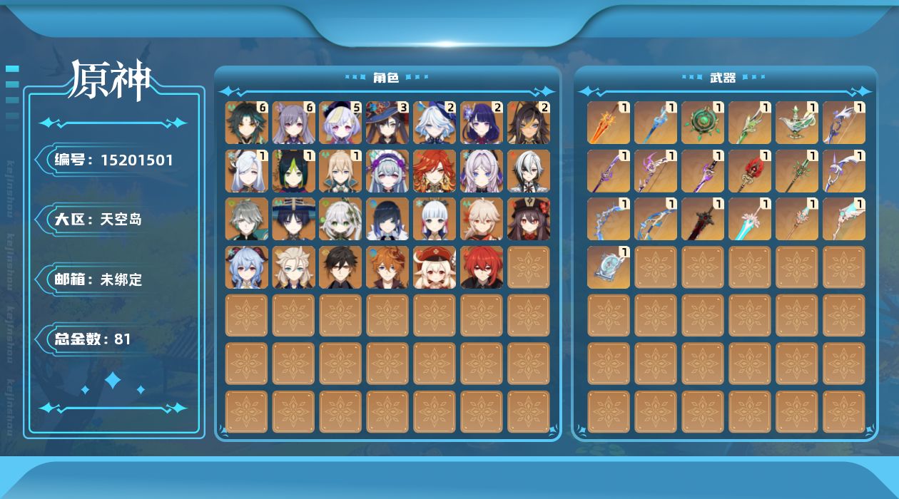 0命阿蕾奇诺,2命芙宁娜,2命迪希雅,0命艾尔海森,0命流浪者,0命纳西妲,1命提纳里,0命夜兰,1命申鹤,2命雷电将军,0命枫原万叶,0命神里绫华,0命钟离,0命胡桃,0命甘雨,满命魈,0命可莉,0命达达利亚,0命阿贝多,满命刻晴,5命七七,1命琴,3命莫娜,0命迪卢克,0命玛薇卡,0命茜特菈莉,0命梦见月瑞希,0命菲林斯,精1静水流涌之辉,精1碧落之珑,精1裁叶萃光,精1千夜浮梦,精1若水,精1终末嗟叹之诗,精1冬极白星,精1薙草之稻光,精1飞雷之弦振,精1雾切之回光,精1护摩之杖,精1四风原典,精1和璞鸢,精1天空之脊,精1天空之翼,精1阿莫斯之弓,精1狼的末路,精1天空之傲,精1焚曜千阳