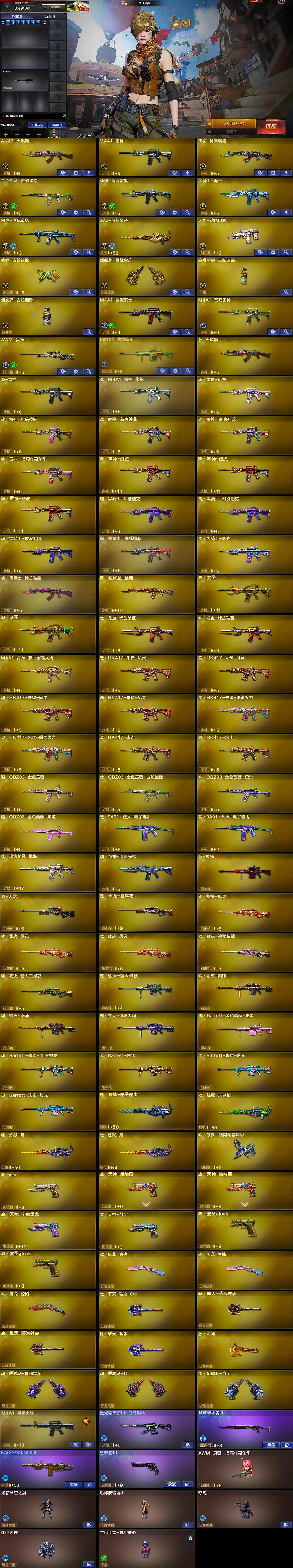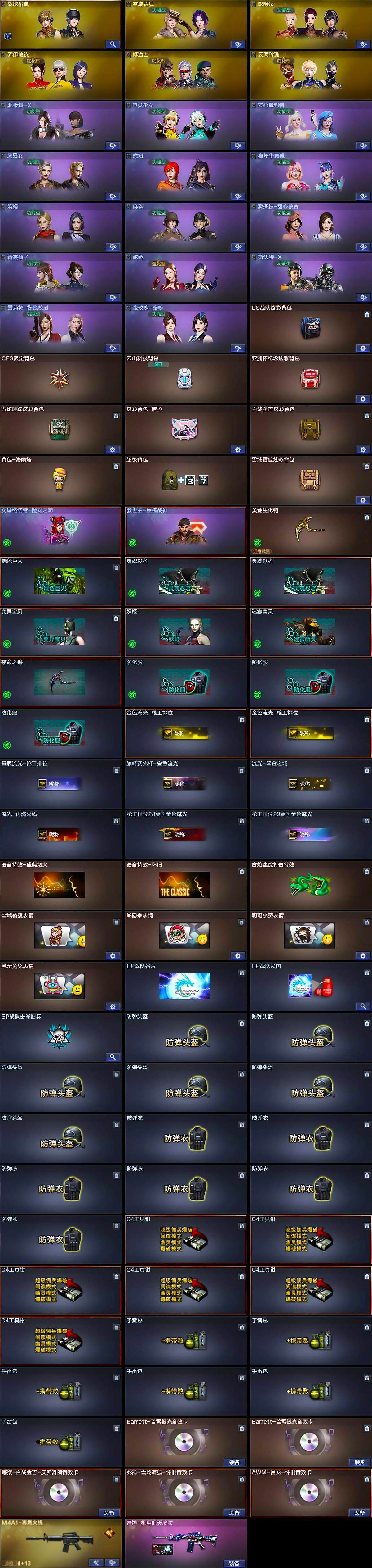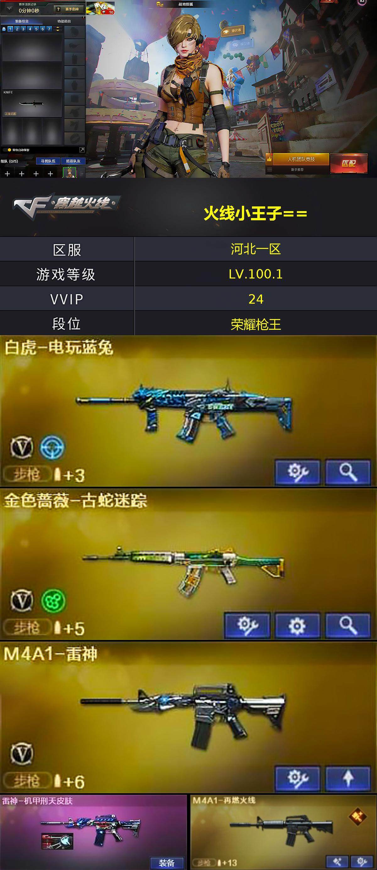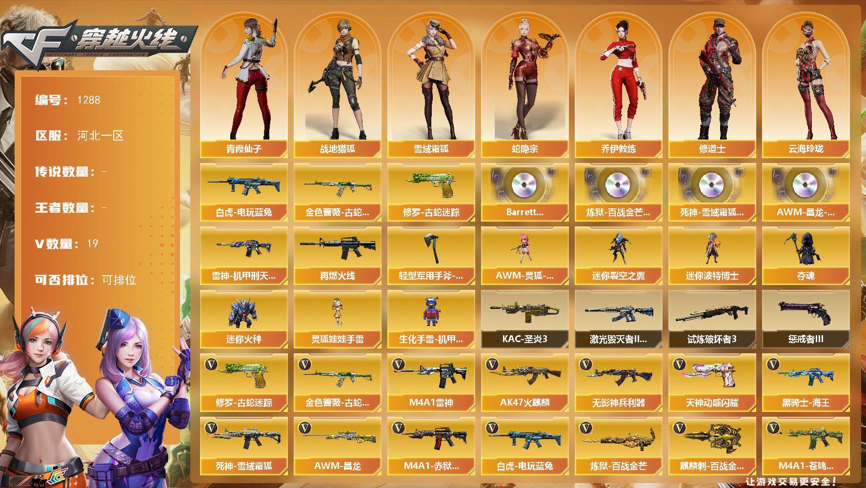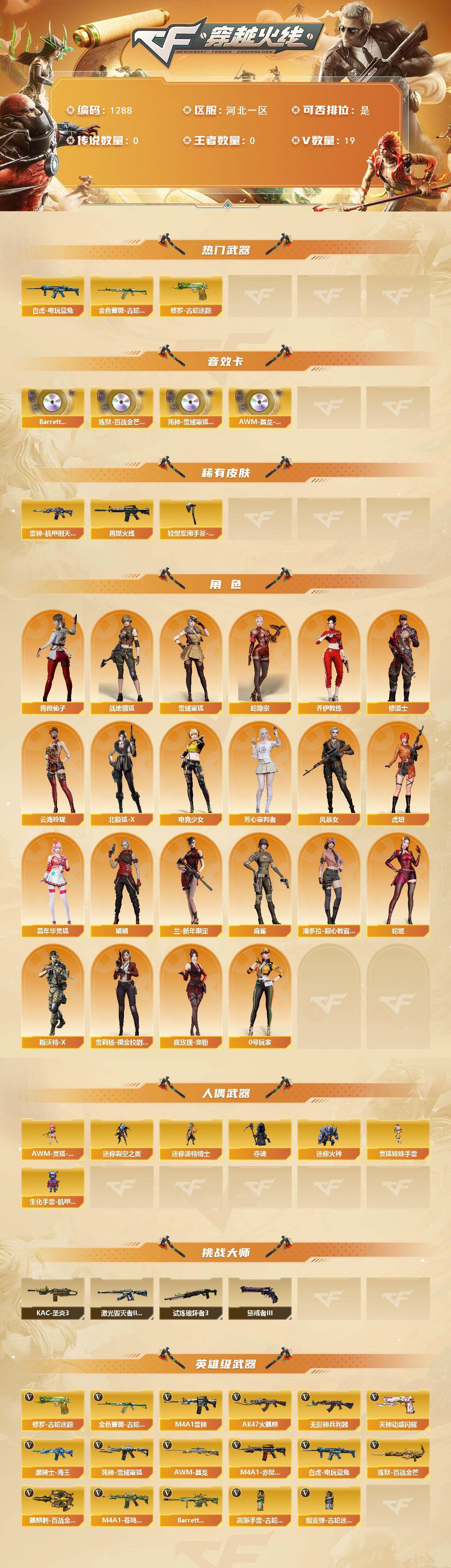 [15203856]河北一区-19V-0王者-0炫金 【热门武器】:金色蔷薇-古蛇迷踪,修罗-古蛇迷踪,白虎-电玩蓝兔 【音效卡】:Barrett-碧霄极光音效卡*2,炼狱-百战金芒-庆典舞曲音效卡,死神-雪域霜狐-怀旧音效卡,AWM-昌龙-怀旧音效卡 【皮肤】:雷神-机甲刑天皮肤,M4A1-再燃火线,轻型军用手斧-再燃火线 【角色】:战地猎狐,雪域霜狐,蛇隐宗,乔伊教练,修道士,云海玲珑,北极狐-X,电竞少女,