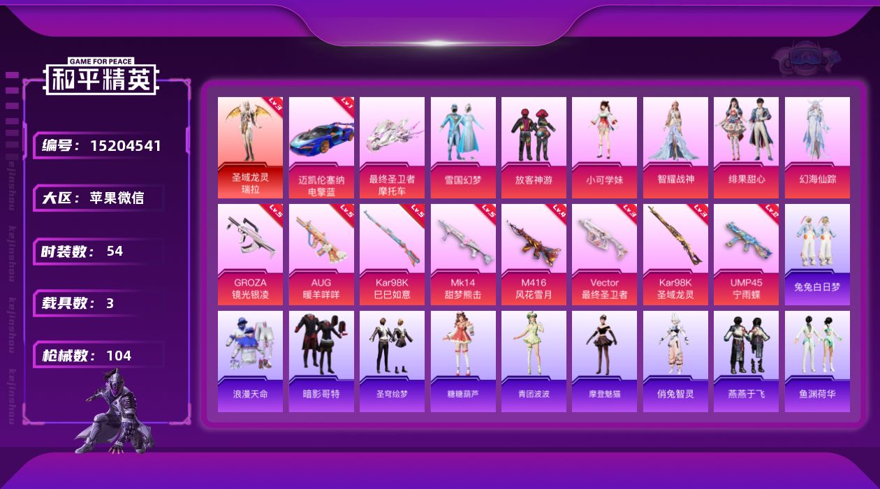 [15204541]素材身法号/无敌战神框1/绝世印记6/地铁满天赋 苹果 微信-无敌战神框-1神装-6粉装-8特效枪-3载具-6粉色飞行器-3.9w热力值-7王牌印记-54套装-104枪皮【红色载具】:迈凯伦塞纳(电擎蓝)(一级)【红色神装等级】:圣域龙灵-瑞拉(三级)【热门品类】:粉装-雪国幻梦,套装-浪漫天命,套装-暗影哥特【粉色载具】:迈凯伦塞纳(电擎蓝),最终圣卫者摩托车,僚机-圣域龙宝【粉色套装】:粉装-雪国幻梦,粉装-放客神游,角色-小可学妹,角色-智耀战神,粉装-绯果甜心,角色-幻海仙踪【粉色枪皮等级】:M416-风花雪月(四级),GROZA-镜光银凌(五级),AUG-暖羊咩咩(五级),UMP45-宁雨蝶(二级),Vector-最终圣卫者(三级),Kar98K-巳巳如意(五级),Kar98K-圣域龙灵(三级),Mk14-甜梦熊击(五级)【粉色飞行器】:月下星之子飞行器,圣域金龙飞行器,绯果甜心飞行器,幻海仙踪飞行器,终晖之翼飞行器