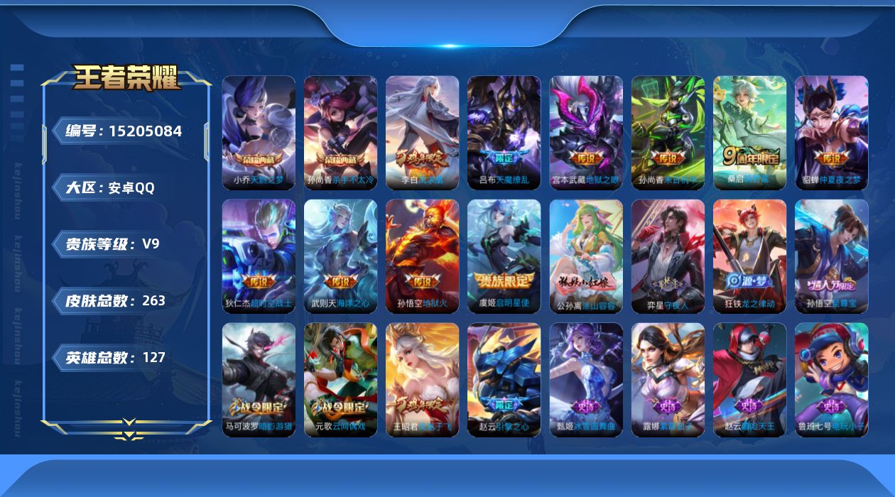 [15205084]安卓Q-V9-永恒钻石II段位-127英雄-263皮肤-2典藏皮肤-1典藏英雄-10传说-66史诗