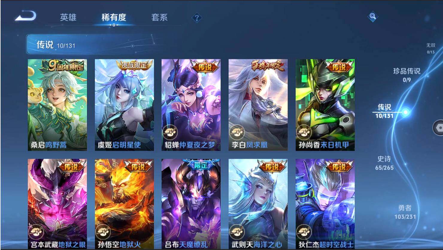 【传说皮肤】:桑启鸣野蒿,虞姬启明星使,貂蝉仲夏夜之梦,李白凤求凰,孙尚香末日机甲,宫本武藏地狱之眼,孙悟空地狱火,吕布天魔缭乱,武则天海洋之心,狄仁杰超时空战士