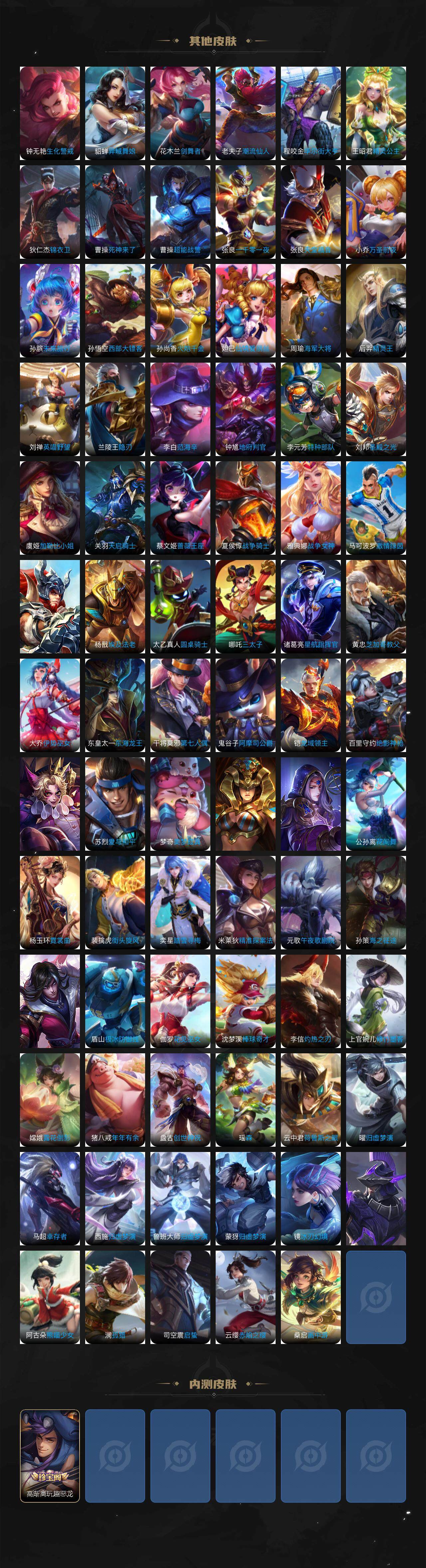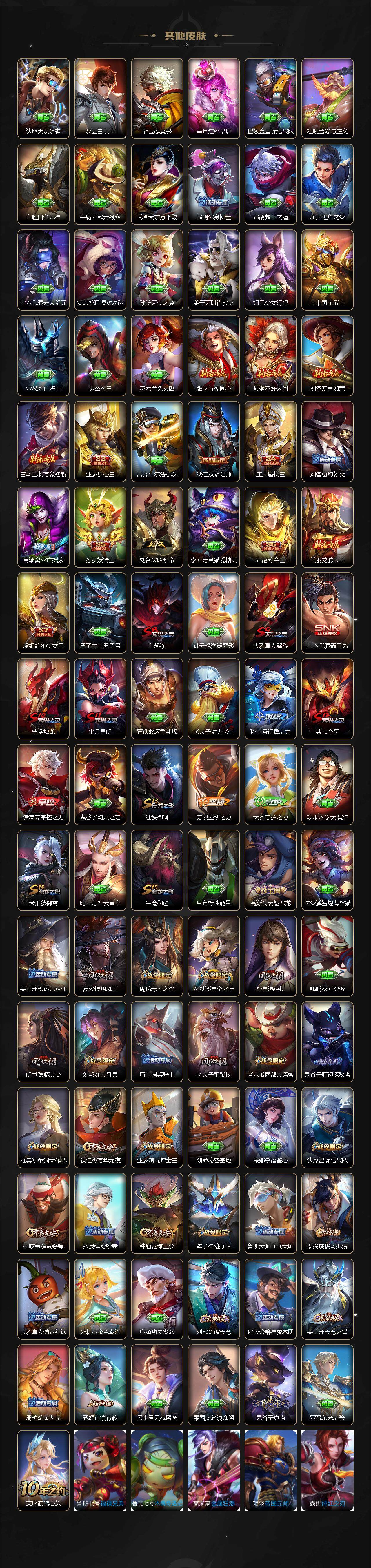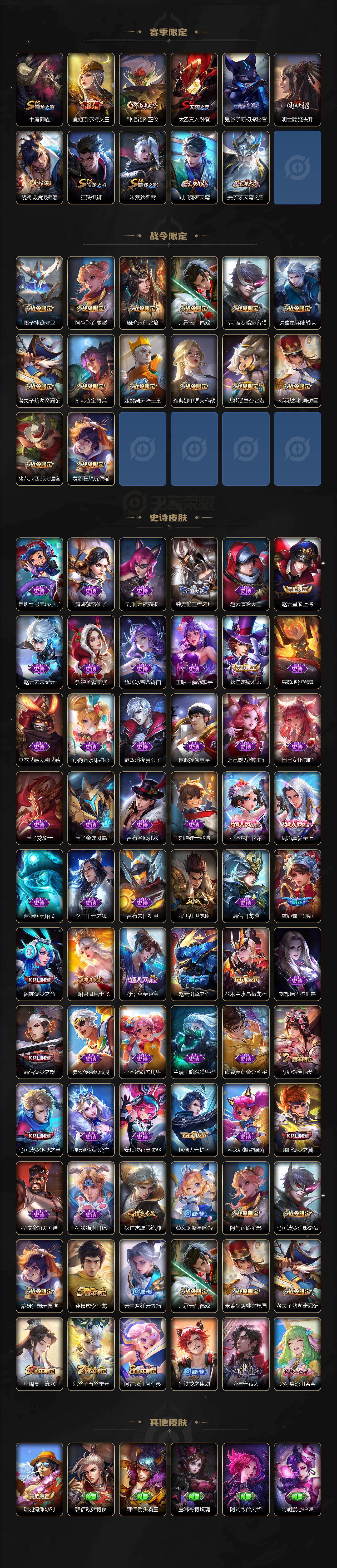【限定皮肤】:白起狰,姜子牙天穹之誓,狄仁杰阴阳师,小乔纯白花嫁,虞姬凯尔特女王,赵云皇家上将,赵云引擎之心,墨子神迹守卫,庄周蜃楼王,庄周高山流水,高渐离死亡摇滚,高渐离玩趣恶龙,阿轲迷踪丽影,钟无艳王者之锤,孙膑妖精王,扁鹊炼金王,芈月重明,吕布天魔缭乱,周瑜真爱至上,周瑜赤莲之焰,元歌云间偶戏,夏侯惇朔风刀,甄姬游园惊梦,曹操烛龙,典韦穷奇,马可波罗逐梦之星,马可波罗暗影游猎,狄仁杰魔术师,狄仁杰万华元夜,达摩星际陆战队,项羽海滩派对,老夫子醍醐杖,老夫子航海奇遇记,貂蝉逐梦之音,程咬金演武夺筹,刘邦夺宝奇兵,韩信逐梦之影,王昭君凤凰于飞,亚瑟狮心王,亚瑟潮玩骑士王,孙悟空至尊宝,牛魔御旌,虞姬霸王别姬,虞姬启明星使,钟馗驱傩正仪,哪吒逐梦之翼,雅典娜单词大作战,蔡文姬繁星吟游,太乙真人饕餮,鬼谷子原初探秘者,鬼谷子五谷丰年,弈星混沌棋,沈梦溪星空之诺,明世隐疑决卦,裴擒虎李小龙,裴擒虎擒涛扼浪,狂铁御狮,米莱狄御霄,米莱狄胡桃异想国,云中君纤云弄巧,猪八戒西部大镖客,蒙犽狂想玩偶喵,阿古朵江河有灵,刘邦剑破天穹,程咬金群星魔术团,周瑜熔金海岸