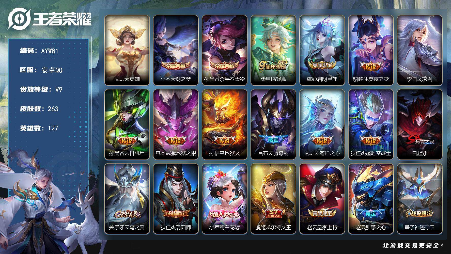 [15205084]安卓Q-V9-永恒钻石II段位-127英雄-263皮肤-2典藏皮肤-1典藏英雄-10传说-66史诗 【荣耀典藏】:武则天英雄,小乔天鹅之梦,孙尚香杀手不太冷 【传说皮肤】:桑启鸣野蒿,虞姬启明星使,貂蝉仲夏夜之梦,李白凤求凰,孙尚香末日机甲,宫本武藏地狱之眼,孙悟空地狱火,吕布天魔缭乱,武则天海洋之心,狄仁杰超时空战士 【限定皮肤】:白起狰,姜子牙天穹之誓,狄仁杰阴阳师,小乔纯白花嫁,虞姬凯尔特女王,赵云皇家上将,赵云引擎之心,墨子神迹守卫,庄周蜃楼王,庄周高山流水,高渐离死亡摇滚,高渐离玩趣恶龙,阿轲迷踪丽影,钟无艳王者之锤,孙膑妖精王,扁鹊炼金王,芈月重明,吕布天魔缭乱,周瑜真爱至上,周瑜赤莲之焰,元歌云间偶戏,夏侯惇朔风刀,甄姬游园惊梦,曹操烛龙,典韦穷奇,马可波罗逐梦之星,马可波罗暗影游猎,狄仁杰魔术师,狄仁杰万华元夜,达摩星际陆战队,项羽海滩派对,老夫子醍醐杖,老夫子航海奇遇记,貂蝉逐梦之音,程咬金演武夺筹,刘邦夺宝奇兵,韩信逐梦之影,王昭君凤凰于飞,亚瑟狮心王,亚瑟潮玩骑士王,孙悟空至尊宝,牛魔御旌,虞姬霸王别姬,虞姬启明星使,钟馗驱傩正仪,哪吒逐梦之翼,雅典娜单词大作战,蔡文姬繁星吟游,太乙真人饕餮,鬼谷子原初探秘者,鬼谷子五谷丰年,弈星混沌棋,沈梦溪星空之诺,明世隐疑决卦,裴擒虎李小龙,裴擒虎擒涛扼浪,狂铁御狮,米莱狄御霄,米莱狄胡桃异想国,云中君纤云弄巧,猪八戒西部大镖客,蒙犽狂想玩偶喵,阿古朵江河有灵,刘邦剑破天穹,程咬金群星魔术团,周瑜熔金海岸 【年限皮肤】:王昭君凤凰于飞,李白凤求凰 【赛季限定】:庄周蜃楼王,孙膑妖精王,扁鹊炼金王,白起狰,芈月重明,夏侯惇朔风刀,曹操烛龙,典韦穷奇,狄仁杰万华元夜,老夫子醍醐杖,程咬金演武夺筹,亚瑟狮心王,牛魔御旌,虞姬凯尔特女王,钟馗驱傩正仪,太乙真人饕餮,鬼谷子原初探秘者,弈星混沌棋,明世隐疑决卦,裴擒虎擒涛扼浪,狂铁御狮,米莱狄御霄,刘邦剑破天穹,姜子牙天穹之誓 【战令限定】:墨子神迹守卫,阿轲迷踪丽影,周瑜赤莲之焰,元歌云间偶戏,马可波罗暗影游猎,达摩星际陆战队,老夫子航海奇遇记,刘邦夺宝奇兵,亚瑟潮玩骑士王,雅典娜单词大作战,沈梦溪星空之诺,米莱狄胡桃异想国,猪八戒西部大镖客,蒙犽狂想玩偶喵 【史诗皮肤】:鲁班七号电玩小子,露娜紫霞仙子,阿轲暗夜猫娘,钟无艳王者之锤,赵云嘻哈天王,赵云皇家上将,