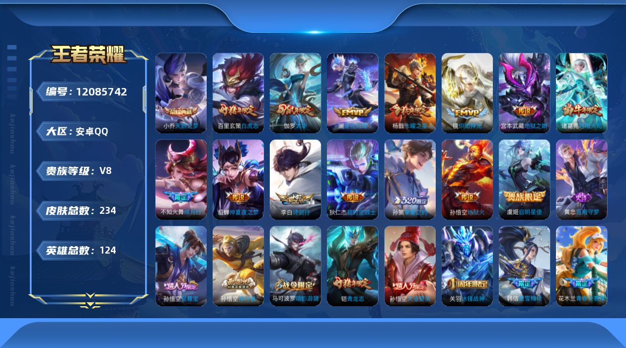 [12085742]V8 1典藏 14传说 124英雄 234皮肤 可修改实名 【稀有英雄】大司命,嬴政(始皇帝),韩信(韩跳跳),夏洛特(夏师傅),艾琳,橘右京(橘子),娜可露露(鸟人),不知火舞,赵云,金蝉(唐僧),戈娅 【荣耀水晶】天鹅之梦(小乔典藏) 【传说皮】地狱火,仲夏夜之梦(大飞蛾),地狱之眼,炽阳神光,超时空战士-狄仁杰,挚爱之约,澜逐花归海 【珍宝阁皮】女武神,玩趣恶龙 【赛季/战令皮】古海寻踪(s33),海盐诗旅(s30),擒涛扼浪(s31),探海日志(s32),天穹祈灯(s34),烛龙(s10),重明(s11),穷奇(s12),御狮(s13),御霄(s14),御旌(s15),御銮(s16),朔风刀(s17),混沌棋(s18),疑决卦(s19),醍醐杖(s20),原初探秘者(s21),万华元夜(s22),演武夺筹(s23),驱傩正仪(s24),千军破阵(s25),猎兽之王,白昼王子,朔望之晖,神迹守卫-钟馗,狮舞东方,西部大镖客-猪八戒,暗影游猎(游乐娃子),圣弓游侠,真爱魔法,沙漠行僧(s26),金庭之子(s27),电玩高手(电玩铁子),午后时光,大漠名商(s28),云中旅人(s29) 【史诗皮】百相守梦-黄忠,电玩小子(小书包),白龙吟,黄金分割率,特工魅影,千年之狐,江河有灵,高渐离燃音魔法,龙骑士(小龙虾),冰冠公主,偶像歌手,晚萤,魅语,暗夜猫娘,末日机甲-吕布,猫狗日记-孙策,乱世虎臣,节奏热浪,修罗,女仆咖啡,水果甜心,天才门将,心灵骇客,功夫厨神,德古拉伯爵,幽灵船长,鬼剑武藏,暗渊魔法,纤云弄巧,拒霜思,逐浪之夏,龙鼓争鸣,曙光守护者,金属风暴,圣诞狂欢,圣诞恋歌,鹰眼统帅,暗夜贵公子,魅力维加斯,黎明之约,奇遇舞章,无心 【限定皮】至尊宝,白虎志(电光耗子),太华(伽罗年限),傲雪梅枪,绯月行,时之彼端,时雨天司(水龙头),遇见飞天,高山流水,诗剑行,五谷丰年,青龙志(铠年限),冰锋战神,游园惊梦,梁祝,李小龙,朱雀志(守约年限),永曜之星,如梦令-后羿,孙行者,大圣娶亲,青春决赛季,神器·万象笔 【普通皮】街头霸王,无尽旅途,逆浪荇歌,聚星闪耀,潮玩造梦师,太极少年,零食大作战,妄想特派,妲己灵卜魔法,尼罗河女神,鬼谷子天穹祈灯(S34),蔚蓝守将,万事如意,五福同心,龙腾万里,归虚梦演-蒙犽,归虚梦演-孙膑,归虚梦演-曜,归虚梦演-西施,海