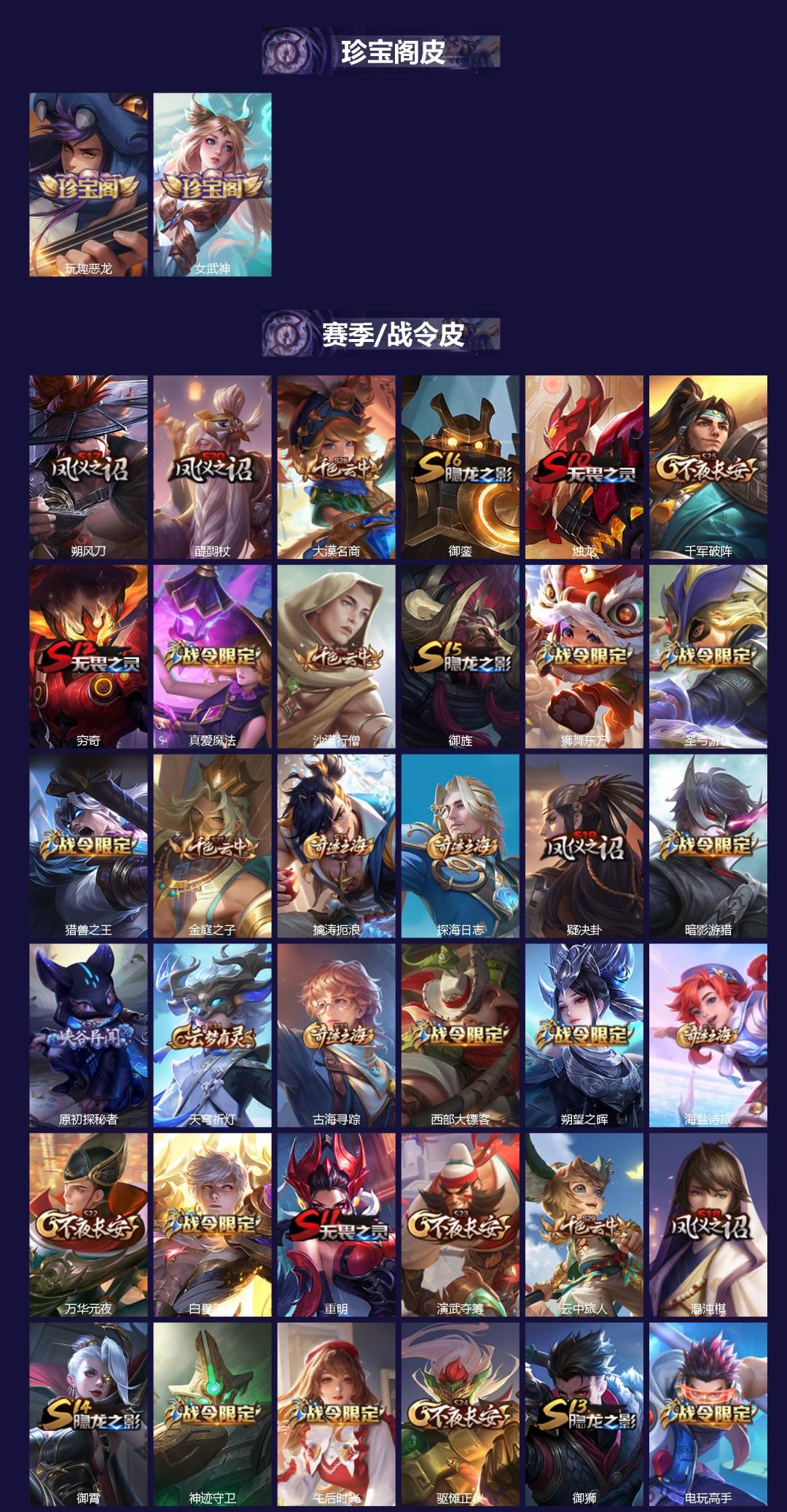 【赛季/战令皮】古海寻踪(s33),海盐诗旅(s30),擒涛扼浪(s31),探海日志(s32),天穹祈灯(s34),烛龙(s10),重明(s11),穷奇(s12),御狮(s13),御霄(s14),御旌(s15),御銮(s16),朔风刀(s17),混沌棋(s18),疑决卦(s19),醍醐杖(s20),原初探秘者(s21),万华元夜(s22),演武夺筹(s23),驱傩正仪(s24),千军破阵(s25),猎兽之王,白昼王子,朔望之晖,神迹守卫-钟馗,狮舞东方,西部大镖客-猪八戒,暗影游猎(游乐娃子),圣弓游侠,真爱魔法,沙漠行僧(s26),金庭之子(s27),电玩高手(电玩铁子),午后时光,大漠名商(s28),云中旅人(s29)