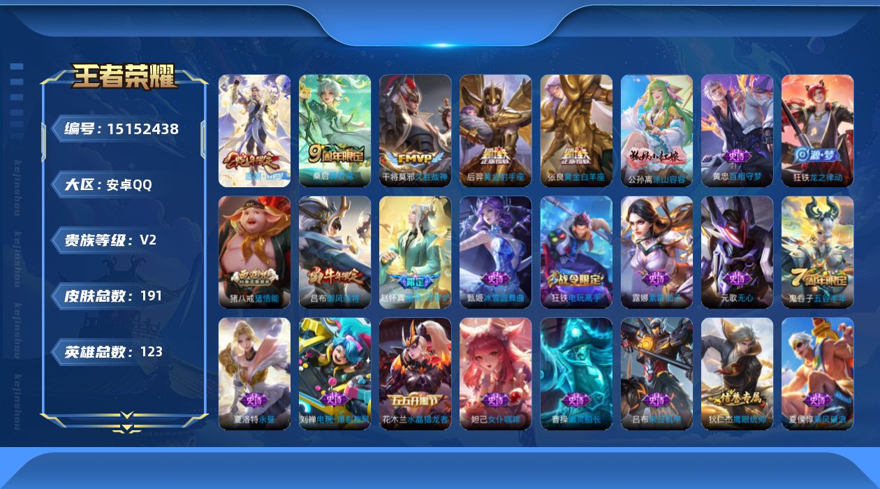[15152438]【特价急出/详情看图:安卓Q-V2-最强王者段位-123英雄-191皮肤--5传说-51史诗