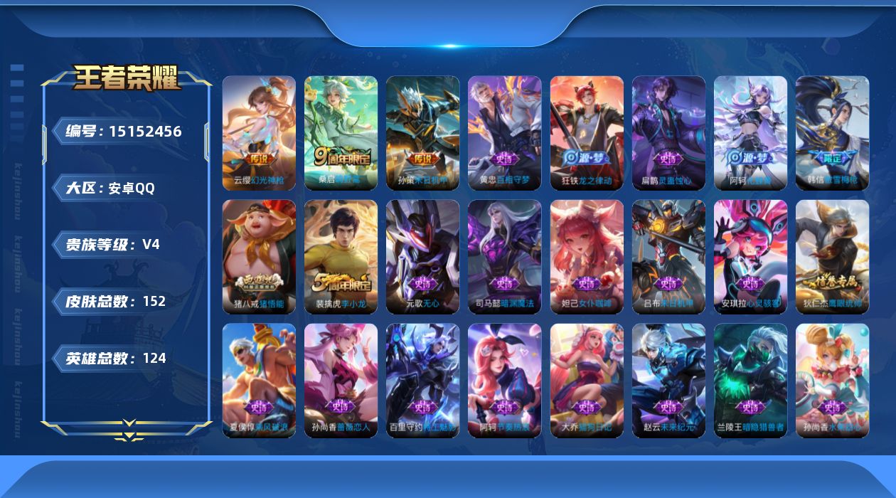 [15152456]【特价急出/详情看图】:安卓Q-V4-永恒钻石I段位-124英雄-152皮肤-3传说-36史诗