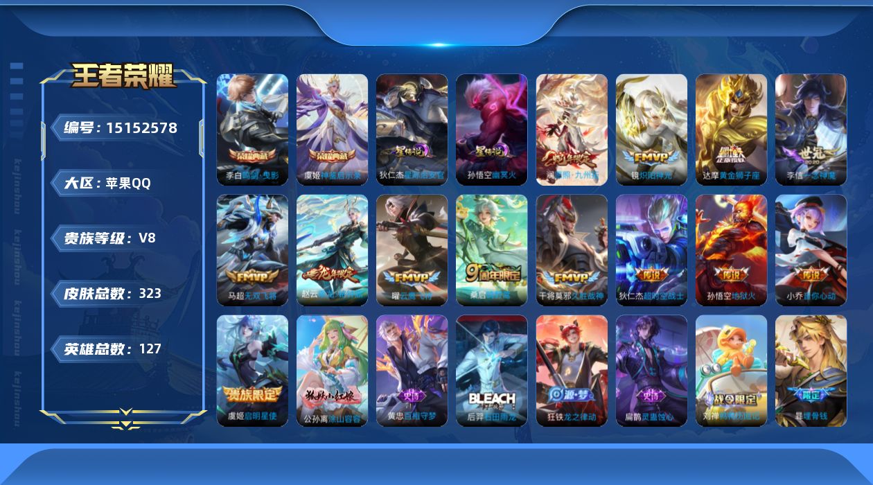 [15152578]【特价急出/详情看图】:苹果Q-V8-至尊星耀II段位-127英雄-323皮肤-2典藏-13传说-2星元-99史诗