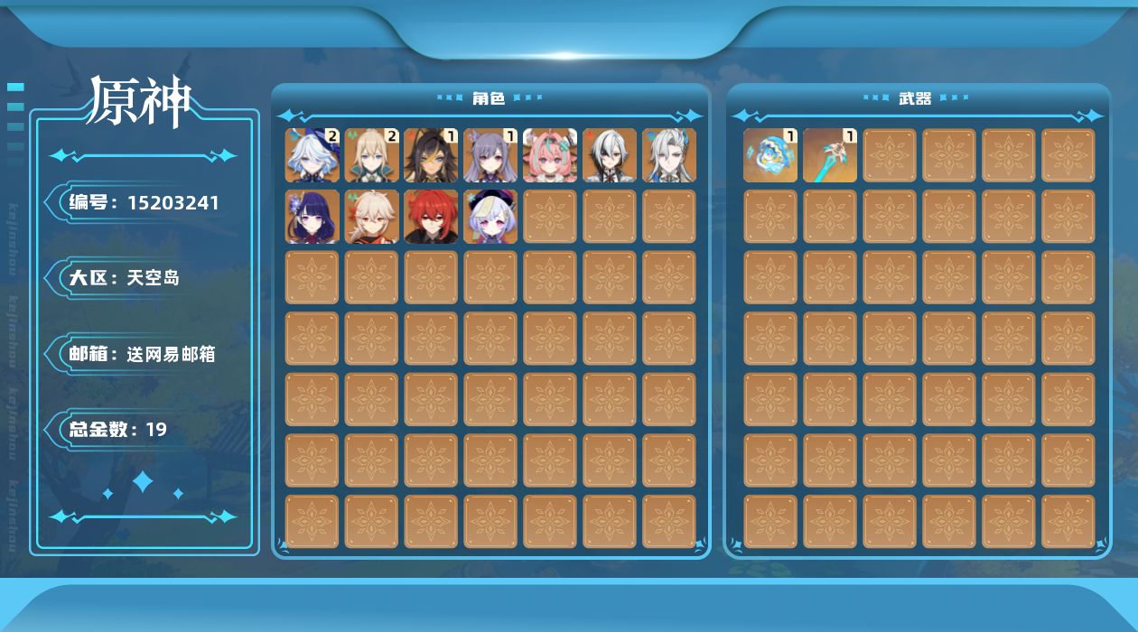 [15203241]56级/19黄/女主/11个五星角色/2个五星武器 0命阿蕾奇诺,2命芙宁娜,0命那维莱特,1命迪希雅,0命雷电将军,0命枫原万叶,1命刻晴,0命七七,2命琴,0命迪卢克,0命瓦雷莎,精1天空之刃,精1冲浪时光