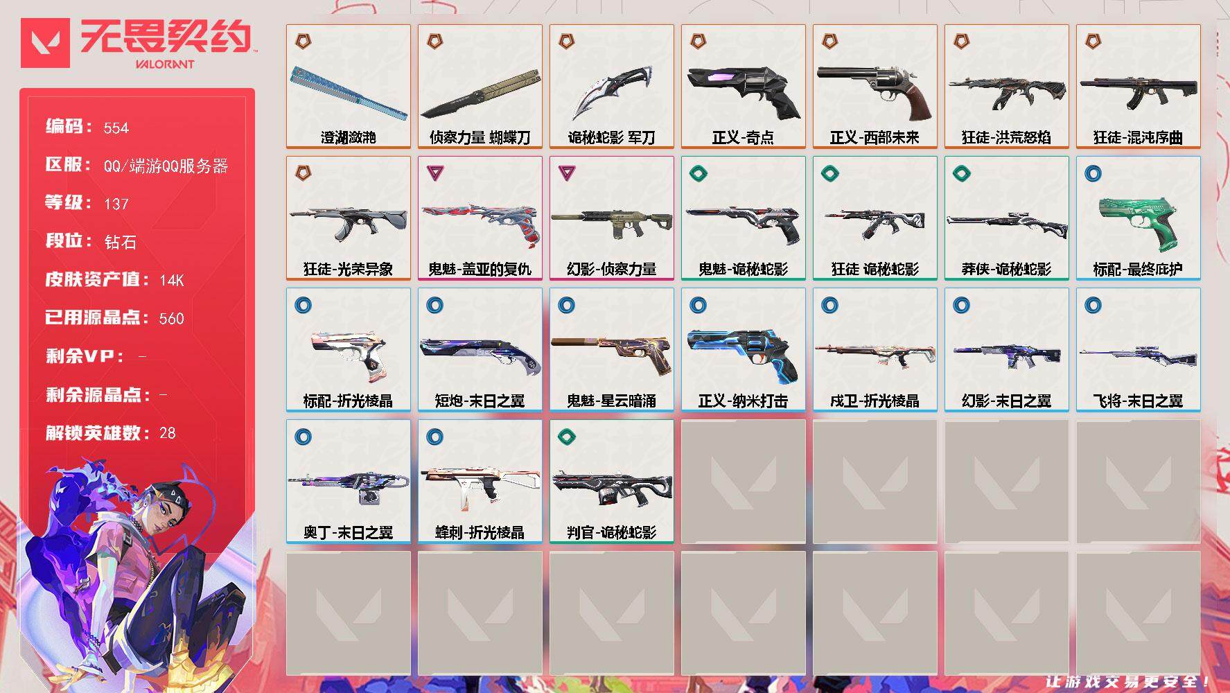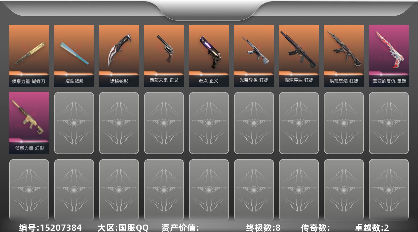 [15207384]【英雄】:幻棱,炼狱,维斯,暮蝶,钛狐,壹决,铁臂,捷风,雷兹,幽影,不死鸟,贤者,猎枭,蝰蛇,零,芮娜,奇乐,尚勃勒,霓虹,斯凯,夜露,星礈,K/O,海神,盖可,黑梦,钢锁 【近战武器】:近战武器-侦察力量 蝴蝶刀,近战武器-澄湖潋滟,近战武器-诡秘蛇影 军刀 【狂徒】:狂徒-洪荒怒焰,狂徒-混沌序曲,狂徒-光荣异象,狂徒-诡秘蛇影 【幻影】:幻影-侦察力量,幻影-末日之翼 【戍卫】:戍卫-折光棱晶 【飞将】:飞将-末日之翼 【莽侠】:莽侠-诡秘蛇影 【奥丁】:奥丁-末日之翼 【判官】:判官-诡秘蛇影 【蜂刺】:蜂刺-折光棱晶 【标配】:标配-最终庇护,标配-折光棱晶 【正义】:正义-奇点,正义-西部未来,正义-纳米打击 【鬼魅】:鬼魅-盖亚的复仇,鬼魅-诡秘蛇影,鬼魅-星云暗涌 【短炮】:短炮-末日之翼 【卡面】:终章:激斗汉堡 卡面,进入射程 卡面,《双城之战》拥抱 卡面,精灵大战 卡面,欢迎来到底城 卡面,南瓜盛典 卡面,修车达人 卡面,正义的化身 卡面,最高舞台 卡面,声感陷阱设计图 卡面,梦幻奶茶 卡面,源能反应 卡面,零点嗅探设计图 卡面,沙雕爆能器 卡面,无畏契约GO!第一卷:芮娜 卡面,清除名单 卡面,无畏契约GO!第一卷:零 卡面,暗枪 卡面,代号红色 卡面,新兵报到 卡面,V契约 卡面,无畏契约 卡面 【喷漆】:嗨宝南瓜灯 喷漆,嘭! 喷漆,都算到了 喷漆,控场勿近 喷漆,小丑猫 喷漆,熊抱 喷漆,超级粉丝 喷漆,捷风差距 喷漆,拼一枪 喷漆,致命优雅 喷漆,我的刀呢? 喷漆,新潮流 喷漆,双击点赞 喷漆,买装还是存钱 喷漆,胜利属于无畏契约 喷漆,GLHF 喷漆,无畏契约 喷漆 【挂饰】:终章:猫猫木乃伊 挂饰,悠闲鸡块 挂饰,伞绳 挂饰,《双城之战》小蛋糕 挂饰,第九季//第三幕 纪念币 挂饰,熔岩灯 挂饰,第九季//第二幕 纪念币 挂饰,袖珍捷风 挂饰,第九季//第一幕 纪念币 挂饰,第八季//第三幕 纪念币 挂饰,第八季//第二幕 纪念币 挂饰 ,天外飞客 挂饰,好运福爪 挂饰,无畏契约 纪念币 挂饰