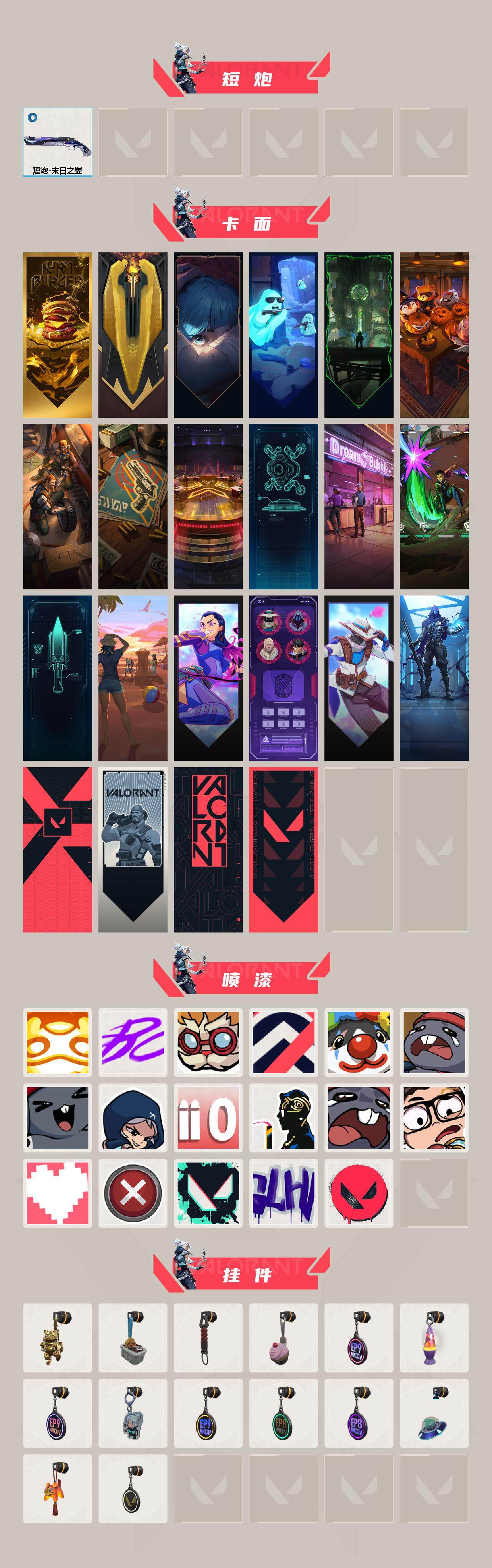 【喷漆】:嗨宝南瓜灯 喷漆,嘭! 喷漆,都算到了 喷漆,控场勿近 喷漆,小丑猫 喷漆,熊抱 喷漆,超级粉丝 喷漆,捷风差距 喷漆,拼一枪 喷漆,致命优雅 喷漆,我的刀呢? 喷漆,新潮流 喷漆,双击点赞 喷漆,买装还是存钱 喷漆,胜利属于无畏契约 喷漆,GLHF 喷漆,无畏契约 喷漆