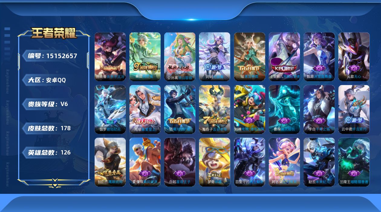 [15152657]安卓Q-V6-永恒钻石III段位-126英雄-178皮肤-1典藏-1传说-45史诗