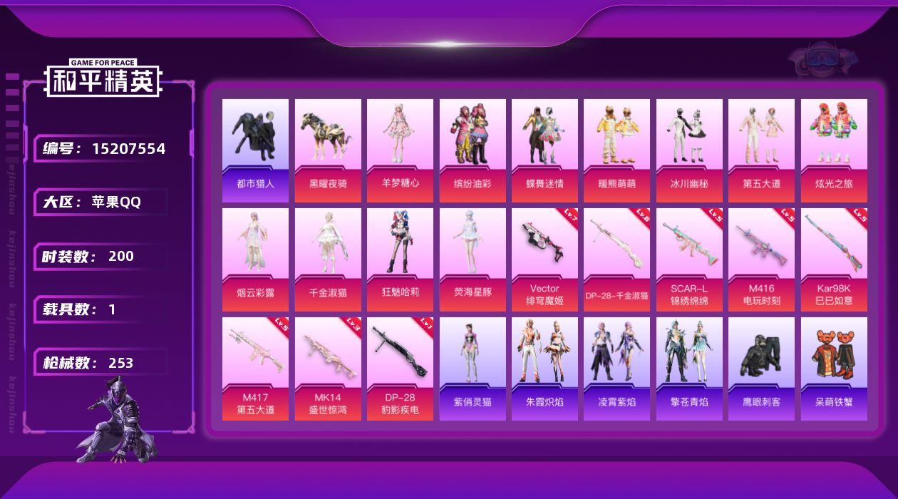 [15207554]可二次【店主推荐捡漏号!可直接换绑】/素材身法号/璀璨碎片1200/扭蛋碎片980 苹果 手Q-12粉装-8特效枪-1载具-12粉色飞行器-8.7w热力值-16王牌印记-200套装-253枪皮【热门品类】:粉装-缤纷油彩,套装-都市猎人,套装-龟仙人,套装-粉红小猪,套装-软软马卡龙,角色-8号机【粉色载具】:黑曜夜骑【粉色套装】:粉装-蝶舞迷情,粉装-缤纷油彩,粉装-暖熊萌萌,粉装-冰川幽秘,粉装-第五大道,粉装-炫光之旅,角色-烟云彩露,角色-千金淑猫,角色-狂魅哈莉,角色-荧海星豚,角色-羊梦糖心【粉色枪皮等级】:SCAR-L-锦绣绵绵(五级),M416-电玩时刻(五级),Vector-绯穹魔姬(七级),Kar98K-巳巳如意(五级),Mk14-盛世惊鸿(三级),M417-第五大道(五级),DP-28-千金淑猫(六级),DP-28-豹影疾电(一级)【粉色飞行器】:星夜魔法师飞行翼,镜光幻境飞行翼,繁龙极客飞行器,绝色倾城飞行器,星空武士飞行器,龙翔九天飞行器,英伦信使飞行器,幽焰列车飞行器,凤舞九天飞行器,绯果甜心飞行器,终晖之翼飞行器