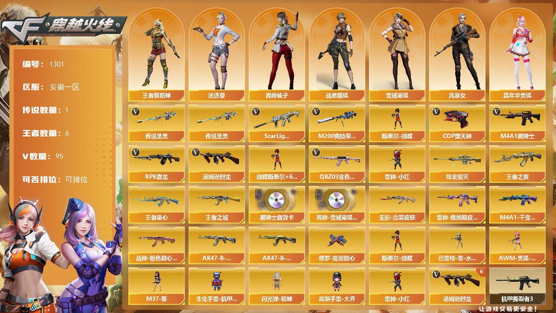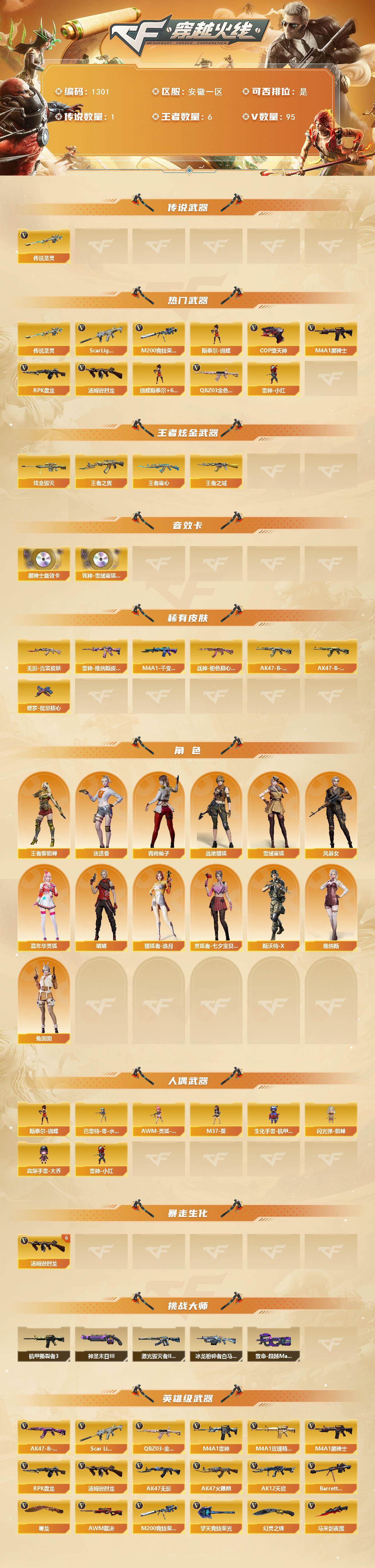 [15207776]安徽一区-95V-6王者-1炫金 【传说武器】:传说圣灵 【热门武器】:传说圣灵,QBZ03-金色蔷薇,Scar Light-白虎,M200-竞技荣光,M4A1-黑骑士,汤姆逊-烈龙*7,RPK-盘龙,斯泰尔-蝴蝶,雷神-小红,COP-堕天神*2 【王者炫金武器】:王者之城,王者之翼,王者霜心,炫金毁灭 【音效卡】:M4A1-黑骑士音效卡,死神-雪域霜狐-怀旧音效卡 【皮肤】:雷神-维纳斯皮肤,M4A1-千变-孔明皮肤,无影-霓裳皮肤,战神-粉色甜心皮肤*2,AK47-B-常胜将军-刘备*2,AK47-B-常胜将军-孙权,修罗-能量核心 【角色】:迷迭香,战地猎狐,王者-葵-貂蝉,雪域霜狐,风暴女,嘉年华灵狐,娟娟,猎狐者-追月,灵狐者-七夕宝贝,青霞仙子,斯沃特-X,兔囡囡,维纳斯 【人偶武器】:雷神-小红,斯泰尔-蝴蝶,巴雷特-零-水下丽影*2,AWM-灵狐-15周年嘉年华,M37-葵,生化手雷-机甲核心,闪光弹-貂蝉,高爆手雷-大乔 【挑战大师】:致命乱世-超越Max,冰龙粉碎者-白马银枪,激光毁灭者III-白马银枪,机甲撕裂者III,神圣爆裂者-末日III*2 【英雄级武器】:AK47-火麒麟*2,M4A1-雷神,M4A1-黑骑士,AK47-无影,AK12-天启,M4A1-堕天神*3,Scar Light-白虎,无影-神兵利器,黑武士-锦绣游龙,死神-雪域霜狐,M4A1-玫瑰精灵,QBZ03-金色蔷薇,AK-47-猩红传说,黑骑士-海王,AK47-B-常胜将军,王者之烈-觉醒版,王者白虎-觉醒版,黑武士-CF网剧冠军,Barrett-毁灭,AWM-裁决,M200-竞技荣光,RPK-盘龙,汤姆逊-烈龙*7,COP-堕天神*2,天神-CF网剧冠军,屠龙*2,麒麟刺-堕天神,马来剑-夜魔,幻灵之锋,擎天-竞技荣光*3,龙啸-堕天神,擎天-CF网剧冠军,王者之击-觉醒版,高爆手雷-堕天神*7,高爆手雷-夜魔*6,高爆手雷-竞技荣光*2,闪光弹-堕天神*7,闪光弹-夜魔*6,闪光弹-竞技荣光*3,烟雾弹-堕天神*7,烟雾弹-夜魔*6,烟雾弹-竞技荣光*2,M4A1-赤狱骑士 【道具】:云山科技背包,亚洲杯纪念炫彩背包,全能枪王背包,炫彩背包,超级背包,雪域霜狐炫彩背包,哔哩哔哩名片,女皇终结者-魔龙之吻,救世主-黑桃战神,黄金生化钩,绿色巨人,灵魂忍者,迷雾幽灵,生