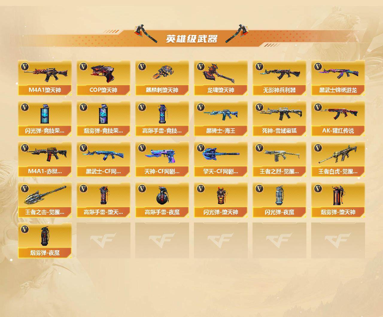 【英雄级武器】:AK47-火麒麟*2,M4A1-雷神,M4A1-黑骑士,AK47-无影,AK12-天启,M4A1-堕天神*3,Scar Light-白虎,无影-神兵利器,黑武士-锦绣游龙,死神-雪域霜狐,M4A1-玫瑰精灵,QBZ03-金色蔷薇,AK-47-猩红传说,黑骑士-海王,AK47-B-常胜将军,王者之烈-觉醒版,王者白虎-觉醒版,黑武士-CF网剧冠军,Barrett-毁灭,AWM-裁决,M200-竞技荣光,RPK-盘龙,汤姆逊-烈龙*7,COP-堕天神*2,天神-CF网剧冠军,屠龙*2,麒麟刺-堕天神,马来剑-夜魔,幻灵之锋,擎天-竞技荣光*3,龙啸-堕天神,擎天-CF网剧冠军,王者之击-觉醒版,高爆手雷-堕天神*7,高爆手雷-夜魔*6,高爆手雷-竞技荣光*2,闪光弹-堕天神*7,闪光弹-夜魔*6,闪光弹-竞技荣光*3,烟雾弹-堕天神*7,烟雾弹-夜魔*6,烟雾弹-竞技荣光*2,M4A1-赤狱骑士
