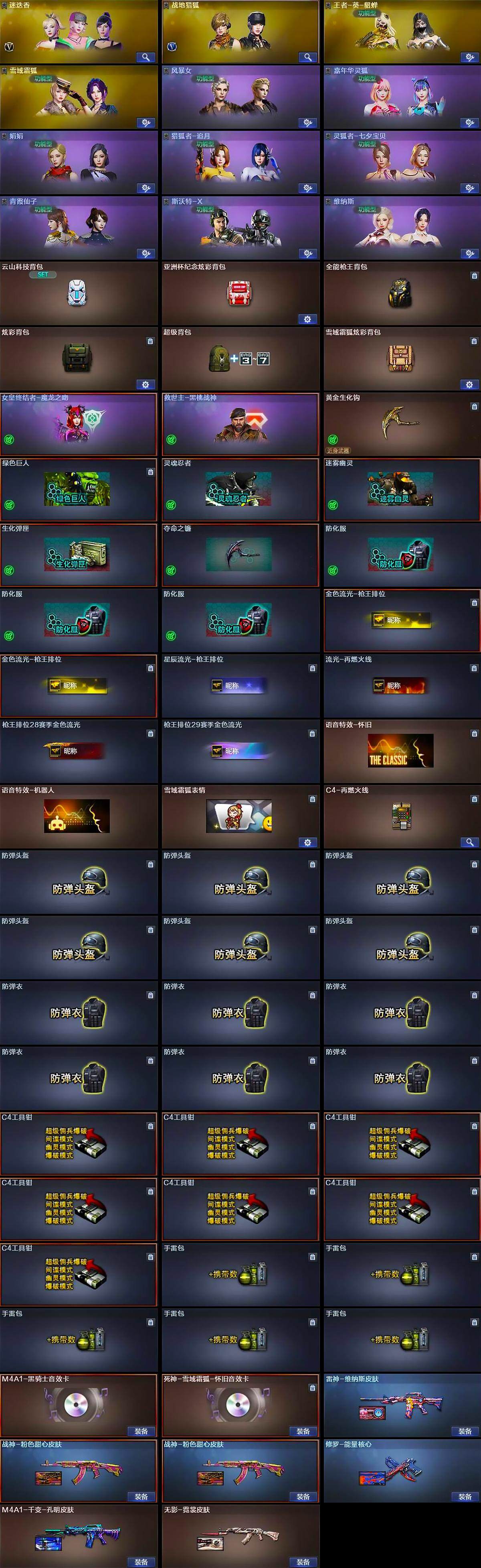 【道具】:云山科技背包,亚洲杯纪念炫彩背包,全能枪王背包,炫彩背包,超级背包,雪域霜狐炫彩背包,哔哩哔哩名片,女皇终结者-魔龙之吻,救世主-黑桃战神,黄金生化钩,绿色巨人,灵魂忍者,迷雾幽灵,生