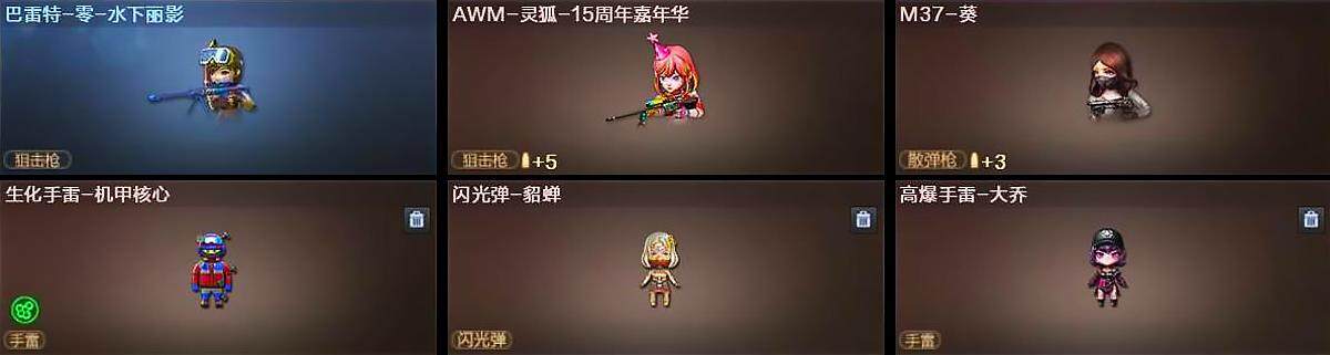 【人偶武器】:雷神-小红,斯泰尔-蝴蝶,巴雷特-零-水下丽影*2,AWM-灵狐-15周年嘉年华,M37-葵,生化手雷-机甲核心,闪光弹-貂蝉,高爆手雷-大乔