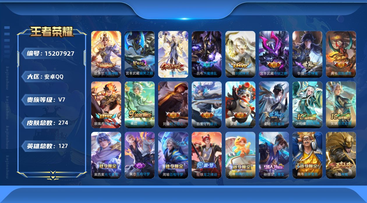[15207927]安卓Q-V7-最强王者段位-127英雄-274皮肤-1典藏皮肤-13传说-63史诗-1星元