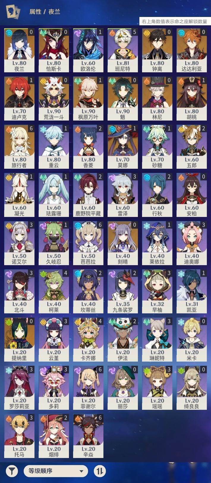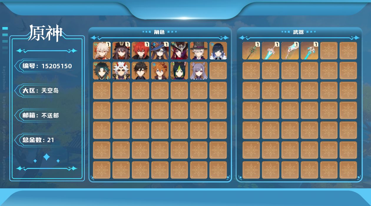 - [15407952]60级/41黄/女主/21个五星角色/10个五星武器 0命闲云,0命娜维娅,0命那维莱特,0命迪希雅,0命纳西妲,0命妮露,1命提纳里,0命夜兰,0命雷电将军,1命枫原万叶,0命神里绫华,0命钟离,1命胡桃,0命魈,0命达达利亚,0命刻晴,2命七七,1命琴,2命莫娜,2命迪卢克,0命玛拉妮,精1千夜浮梦,精1圣显之钥,精1若水,精1护摩之杖,精1磐岩结绿,精1和璞鸢,精1天空之翼,精1天空之卷,精1天空之傲