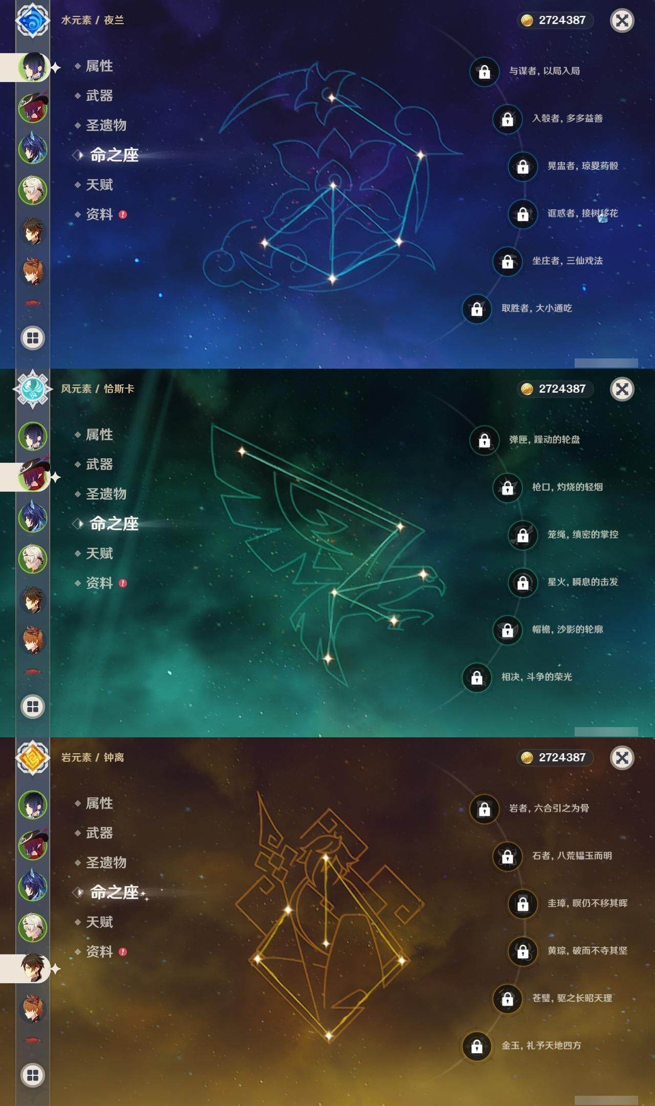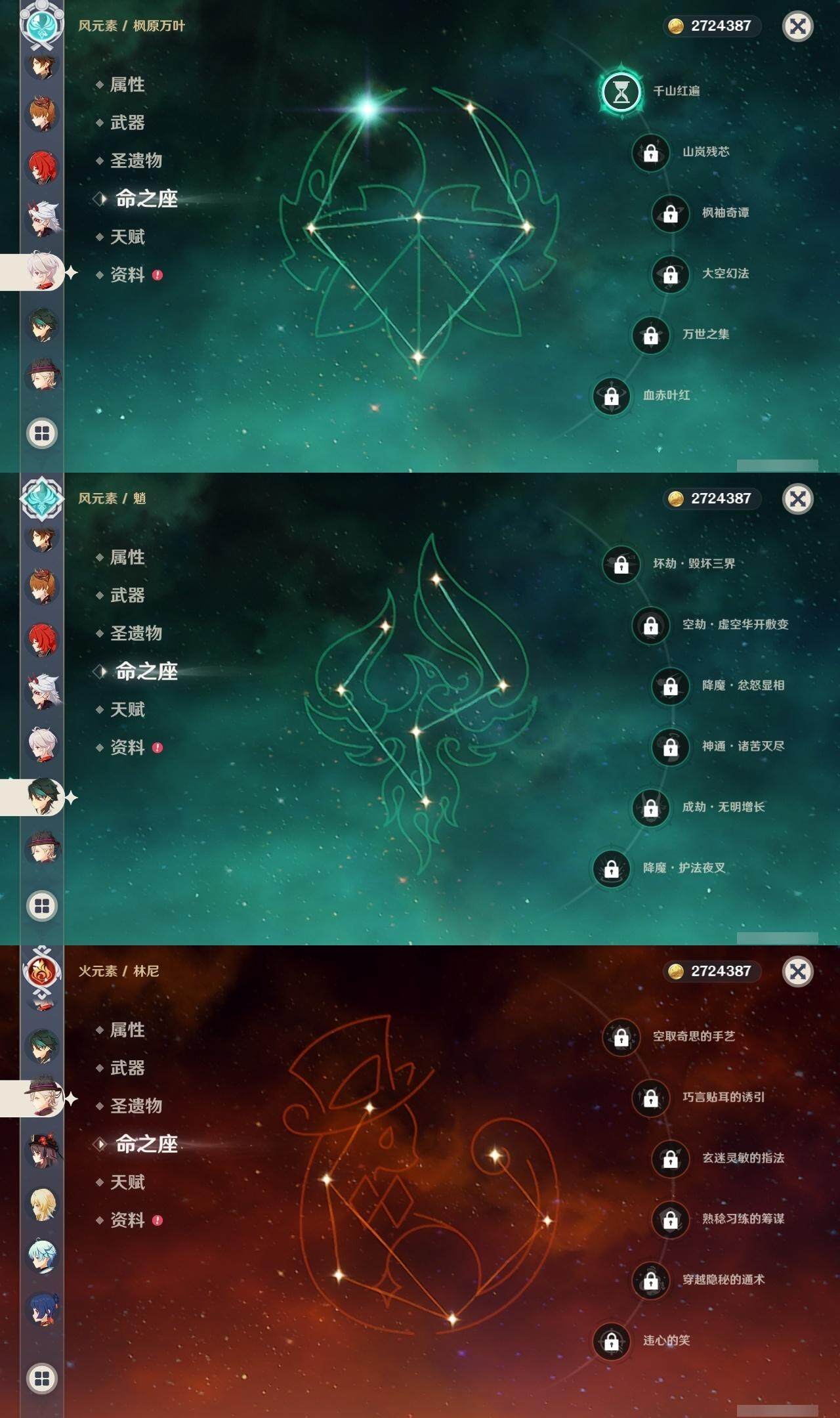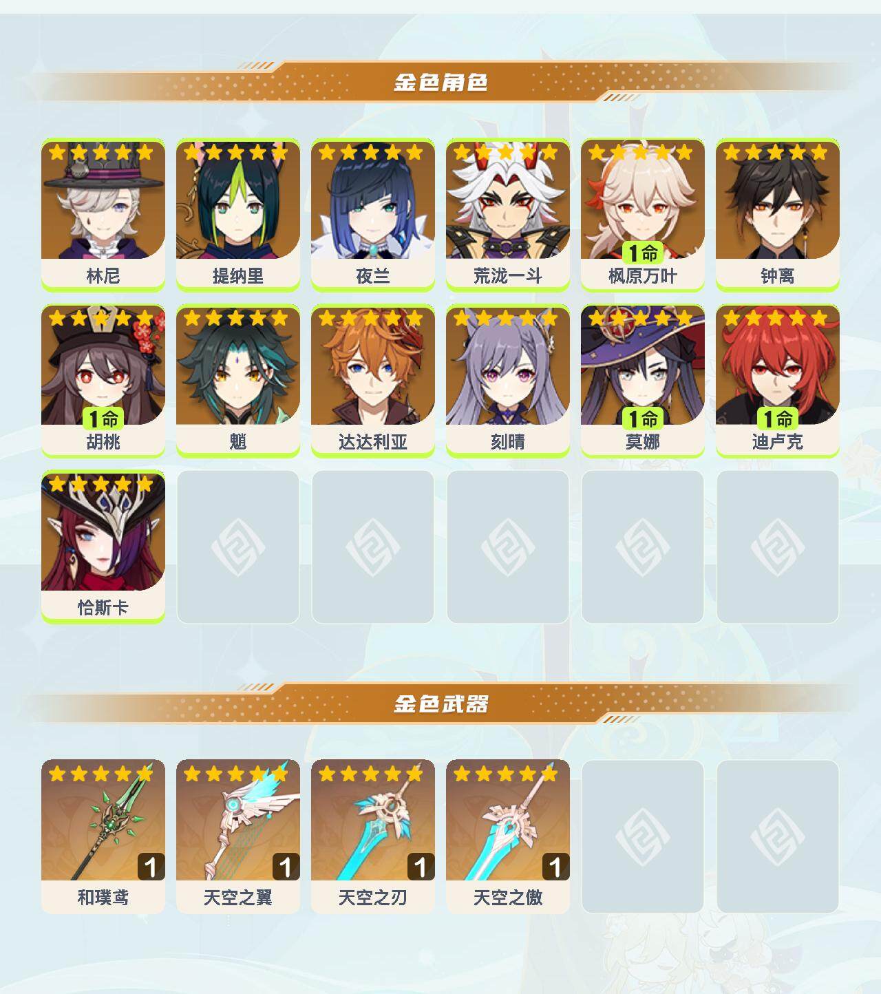 0命林尼,0命提纳里,0命夜兰,0命荒泷一斗,1命枫原万叶,0命钟离,1命胡桃,0命魈,0命达达利亚,0命刻晴,1命莫娜,1命迪卢克,0命恰斯卡,精1和璞鸢,精1天空之翼,精1天空之刃,精1天空之傲