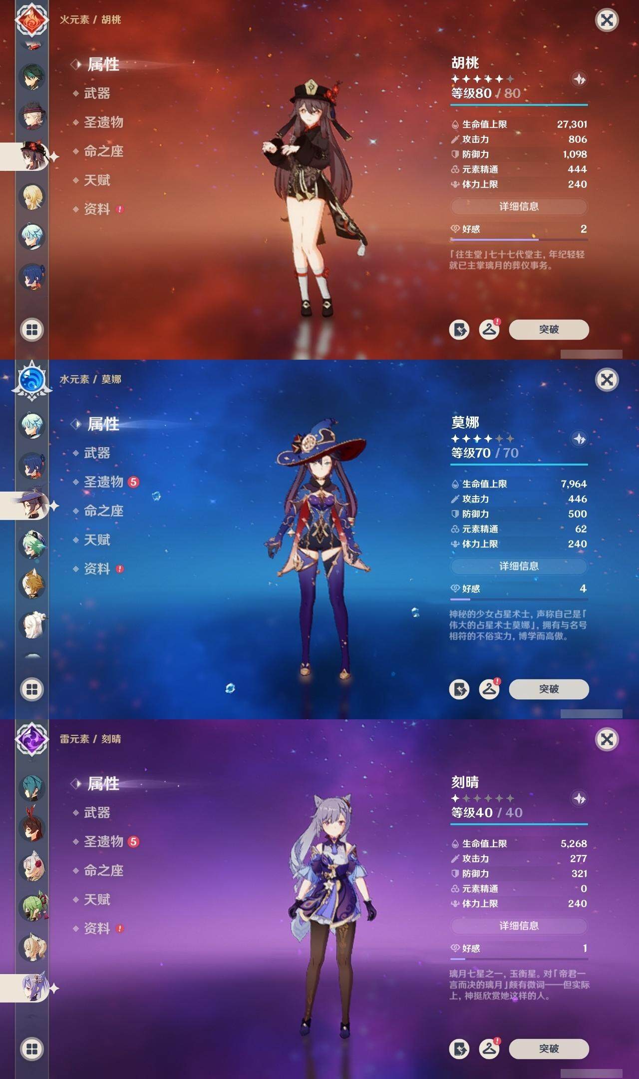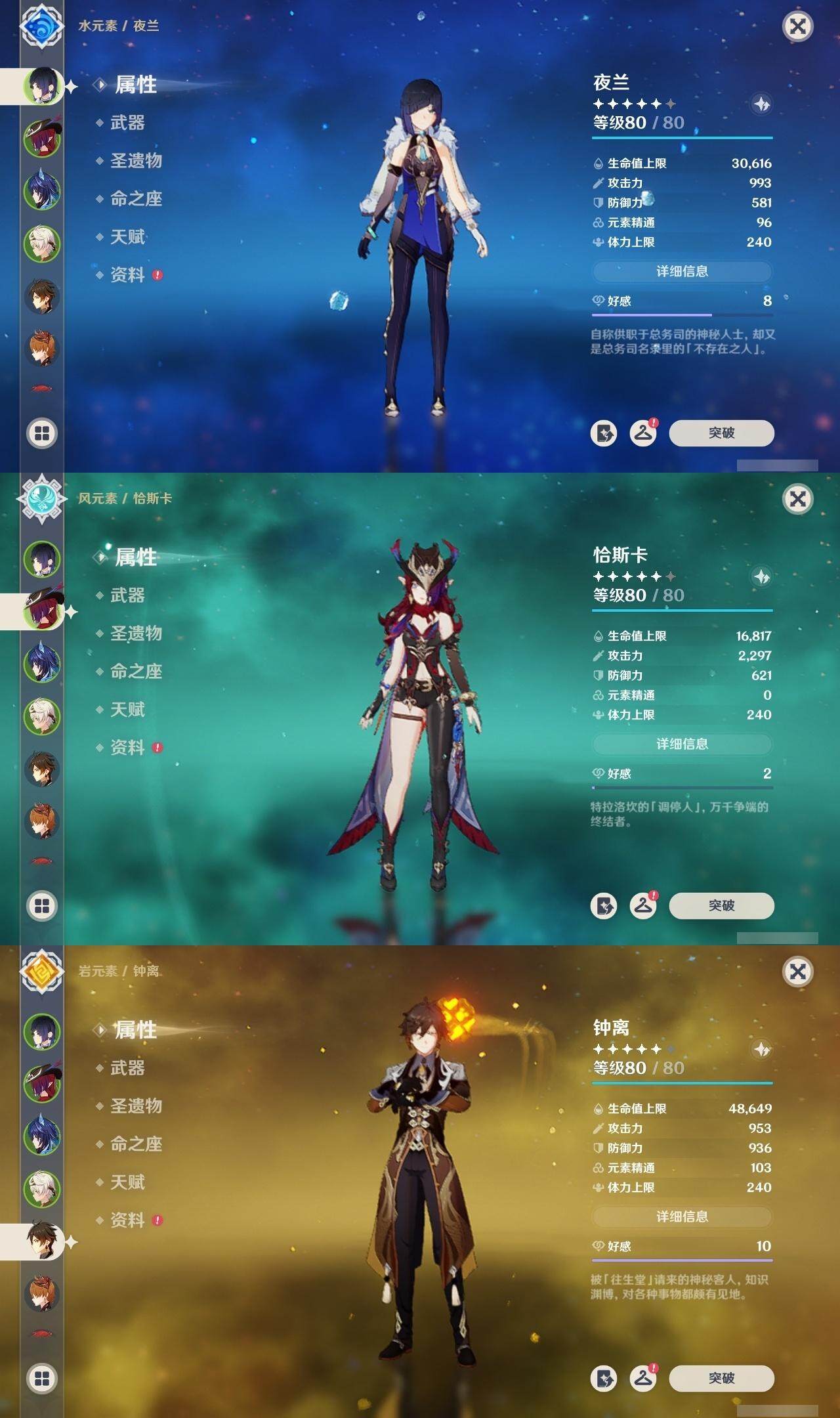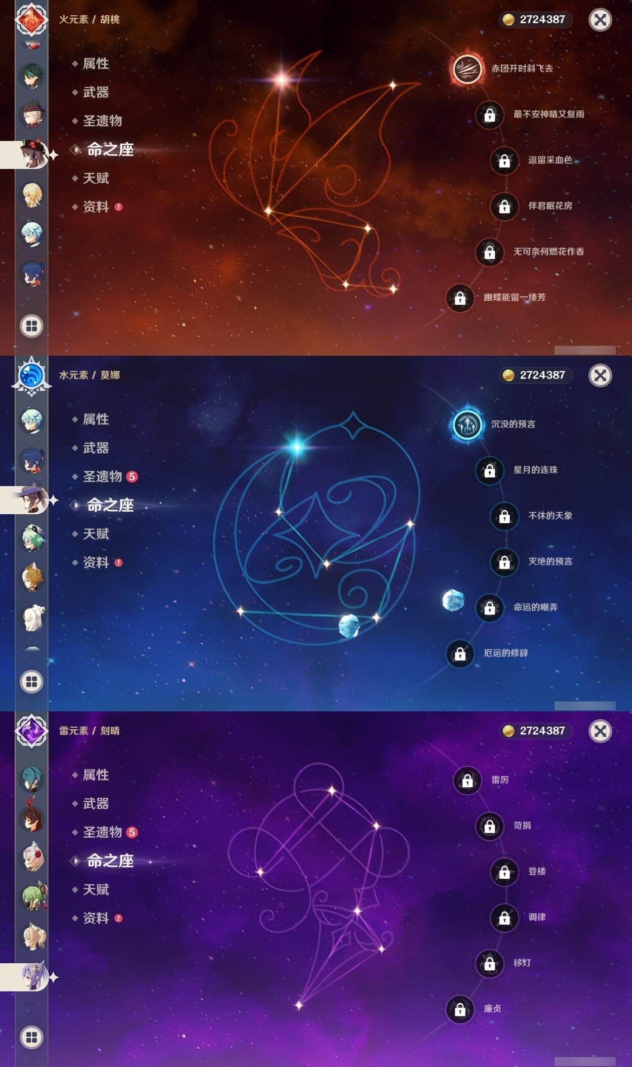 0命林尼,0命提纳里,0命夜兰,0命荒泷一斗,1命枫原万叶,0命钟离,1命胡桃,0命魈,0命达达利亚,0命刻晴,1命莫娜,1命迪卢克,0命恰斯卡,精1和璞鸢,精1天空之翼,精1天空之刃,精1天空之傲