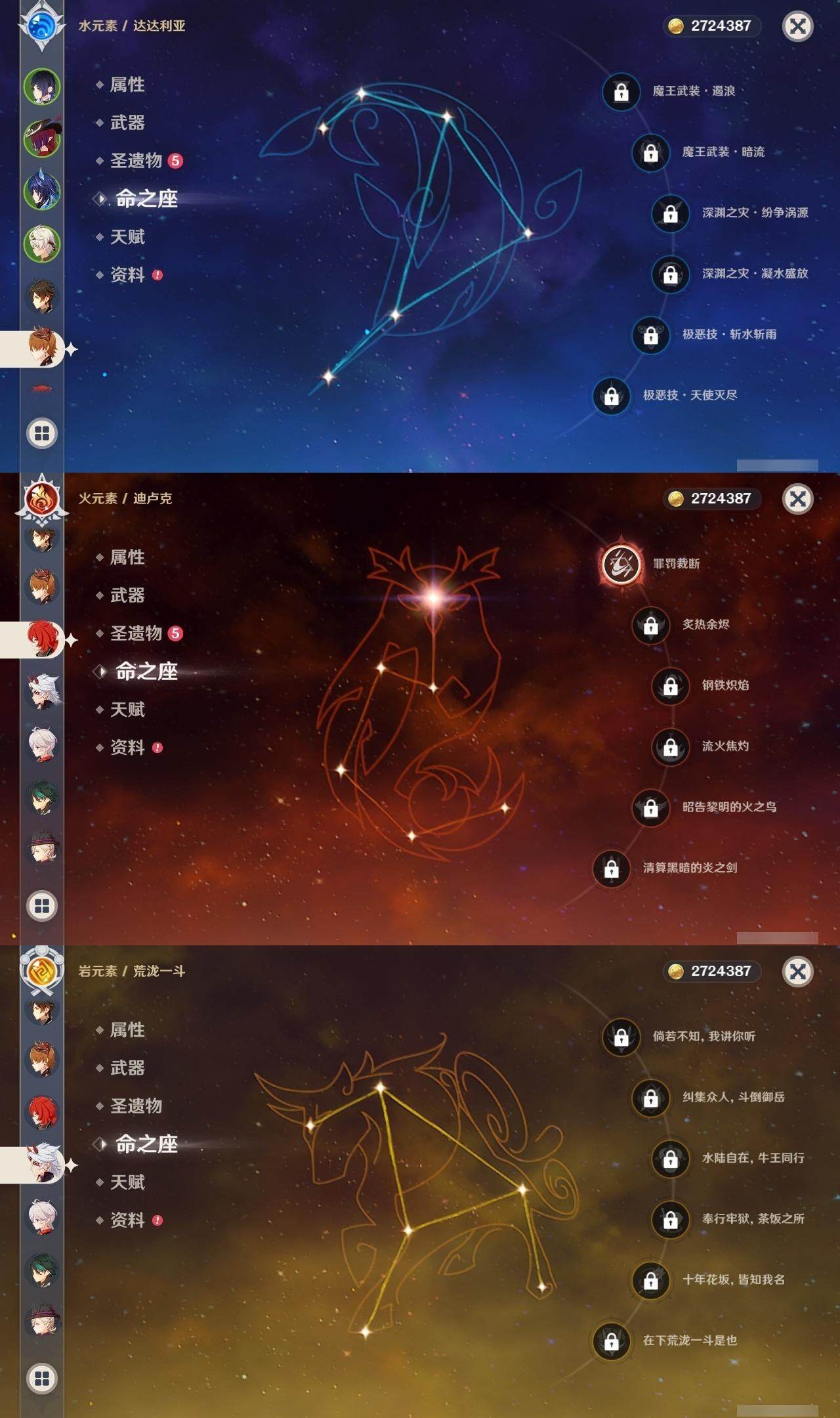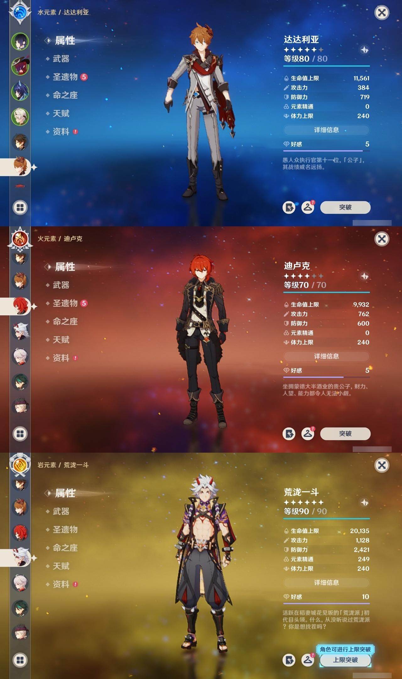 钟离,达达利亚,迪卢克,荒泷一斗,枫原万叶,魈,胡桃,莫娜,刻晴