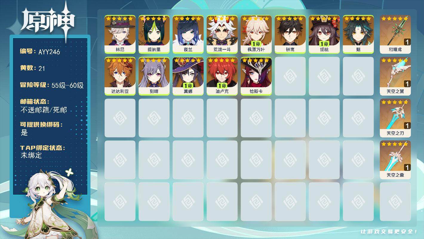 [15205150]56级/21黄/女主/13个五星角色/4个五星武器 0命林尼,0命提纳里,0命夜兰,0命荒泷一斗,1命枫原万叶,0命钟离,1命胡桃,0命魈,0命达达利亚,0命刻晴,1命莫娜,1命迪卢克,0命恰斯卡,精1和璞鸢,精1天空之翼,精1天空之刃,精1天空之傲