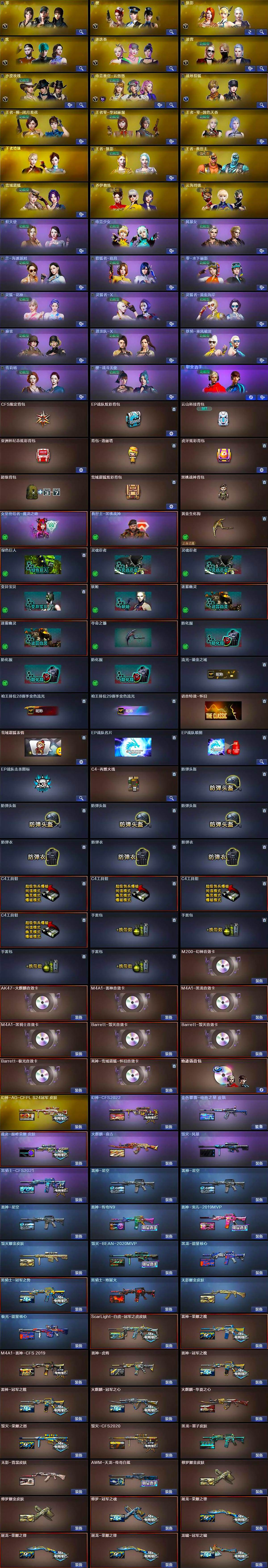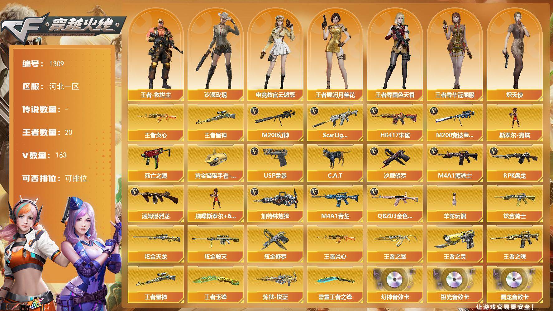 - [13078672]江西一区-118V-12王者-6炫金 【热门武器】:QBZ03-金色蔷薇,HK417-朱雀,M4A1-青龙,M200-幻神,死亡之眼*2,金色小号,C.A.T,毒蜂,M4A1-黑骑士,汤姆逊-烈龙*6,RPK-盘龙*6,加特林-炼狱*2,斯泰尔-蝴蝶,USP-雷暴*2,沙鹰-修罗*3,Knife-冠军之刃,黄金猫猫手套-白鲨 【王者炫金武器】:炫金骑士,炫金天龙,炫金雷神,炫金武士,炫金超新星*2,王者冰魄,王者之鲨,王者之幻,王者之翼,王者之怒,王者之魂*2 【音效卡】:M200-幻神音效卡,AK47-火麒麟音效卡,M4A1-雷神音效卡,M4A1-黑骑士音效卡,Barrett-毁灭音效卡 【稀有皮肤】:幻神-冠军之幻,幻神-CFS2022,M200-幻神-荣耀世冠白鲨,QBZ03-荣耀世冠白鲨,QBZ03-巅峰荣耀皮肤,雷神-能量核心*2,雷神-星空,雷神-荣耀世冠AG,火麒麟-巅峰荣耀,火麒麟-心动糖果,黑骑士-AG-S4冠军典藏,M4A1-黑龙-361,毁灭耀金皮肤,毁灭-星空,毁灭-冠军之怒,毁灭-风暴,天龙-能量核心,AWM-天龙-传奇白鲨,无影-霓裳皮肤,擎天-冠军之击 【角色】:王者影豹,灵狐者-职业经理,零,葵,春,隼,魅影,铁骑荣耀,荒漠琉璃,战地猎狐 【人偶武器】:斯泰尔-蝴蝶,AWM-灵狐-15周年嘉年华,M37-葵,COP-旗袍,C.A.T,迷你深渊冰龙,迷你超能女侍,迷你牛魔王,迷你牛牛,迷你生化手雷*3 【暴走生化】:斯泰尔-蝴蝶,毒蜂,死亡之眼*2 【挑战大师】:神圣爆裂者III,激光毁灭者III,激光毁灭者III-白马银枪,冰龙粉碎者-白马银枪 【英雄级武器】:AK47-雷暴*3,USP-雷暴*2,斩神刀-雷暴,烈火-动感闪耀,天神-动感闪耀,屠龙-动感闪耀,手雷-动感闪耀,QBZ03-金色蔷薇,HK417-朱雀,M4A1-青龙,无影-神兵利器,M4A1-雷神*3,M4A1-黑龙*4,M4A1-玫瑰精灵,M4A1-黑骑士,M4A1-死神,RPK-盘龙*6,加特林-炼狱*2,汤姆逊-烈龙*6,AK47-无影,AK47-火麒麟*3,AK47-黑武士*4,AK12-天启*2,AWM-天龙,Barrett-毁灭*4,Barrett-极光,M4A1-龙血*2,AA-12-雷霆,M200-幻神,AK47-黑鲨,AK-47-猩红传说,AK47-B