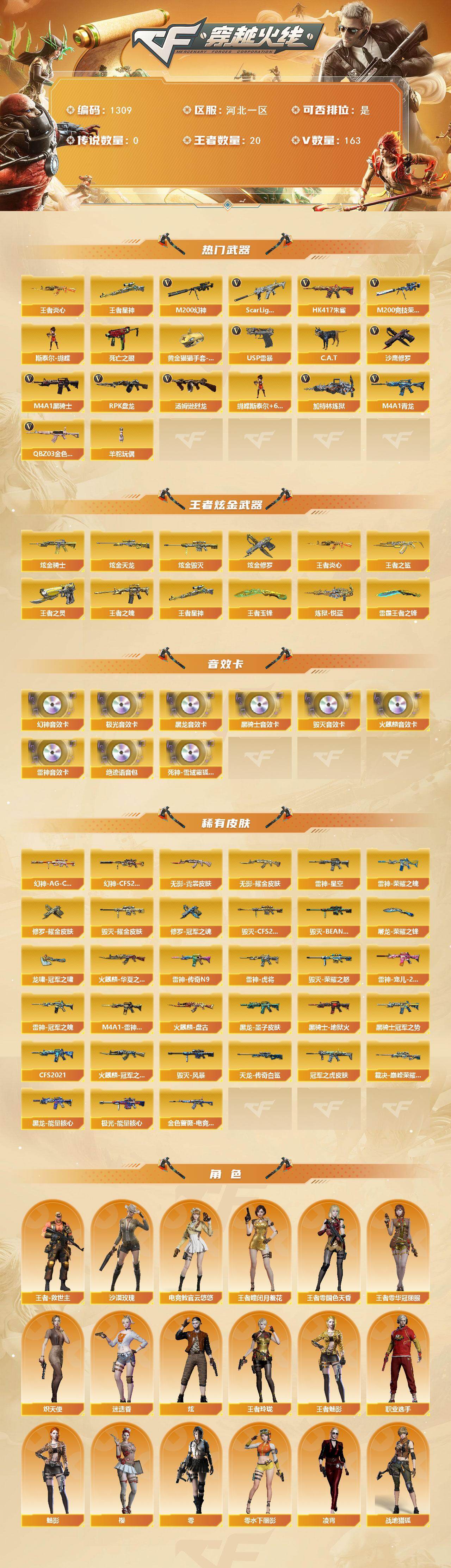[15208637]河北一区-163V-20王者-6炫金 【热门武器】:王者星神,QBZ03-金色蔷薇,Scar Light-白虎,HK417-朱雀,M4A1-青龙,M200-幻神,M200-竞技荣光,死亡之眼,王者炎心,C.A.T,M4A1-黑骑士*7,汤姆逊-烈龙*6,RPK-盘龙,加特林-炼狱*2,斯泰尔-蝴蝶,羊驼玩偶,USP-雷暴,沙鹰-修罗*5,黄金猫猫手套-白鲨 【王者炫金武器】:王者炎心,王者之鲨