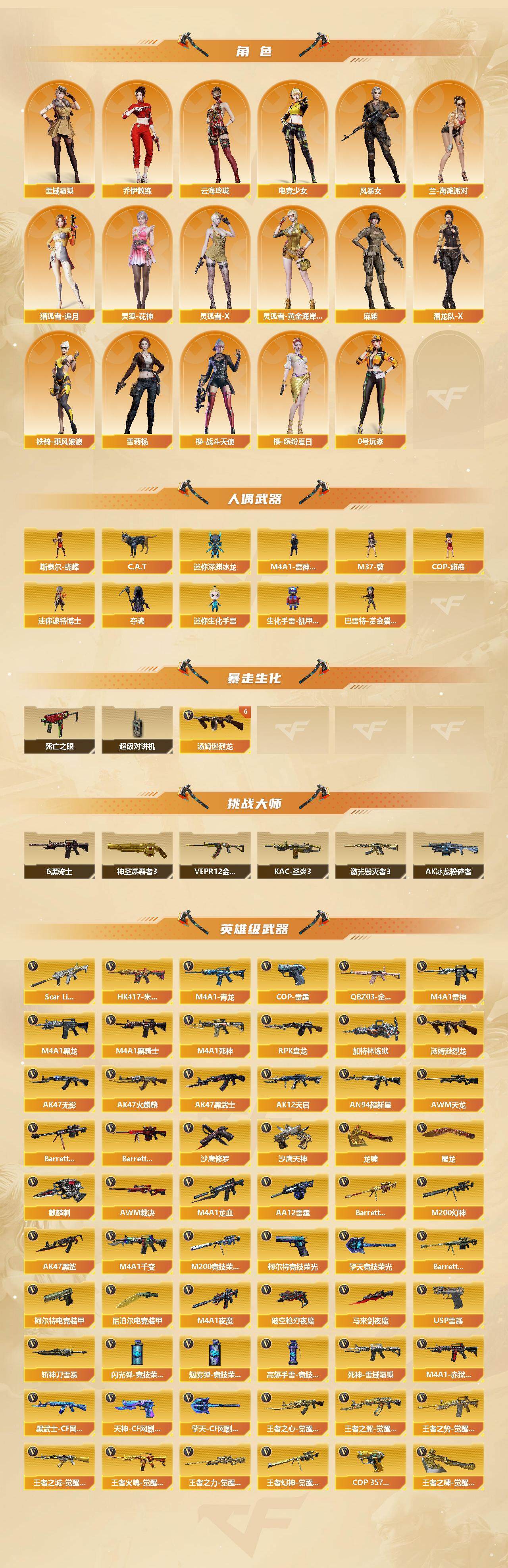 【热门武器】:王者星神,QBZ03-金色蔷薇,Scar Light-白虎,HK417-朱雀,M4A1-青龙,M200-幻神,M200-竞技荣光,死亡之眼,王者炎心,C.A.T,M4A1-黑骑士*7,汤姆逊-烈龙*6,RPK-盘龙,加特林-炼狱*2,斯泰尔-蝴蝶,羊驼玩偶,USP-雷暴,沙鹰-修罗*5,黄金猫猫手套-白鲨