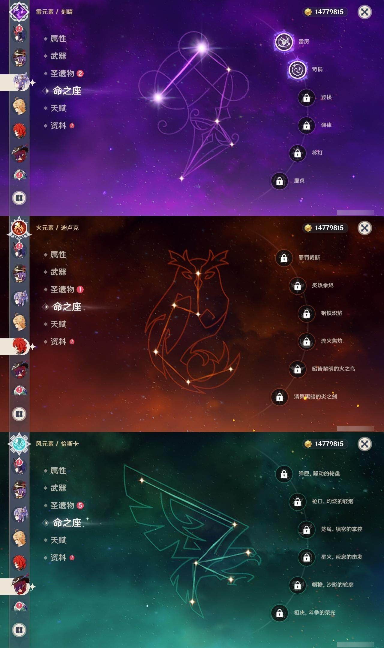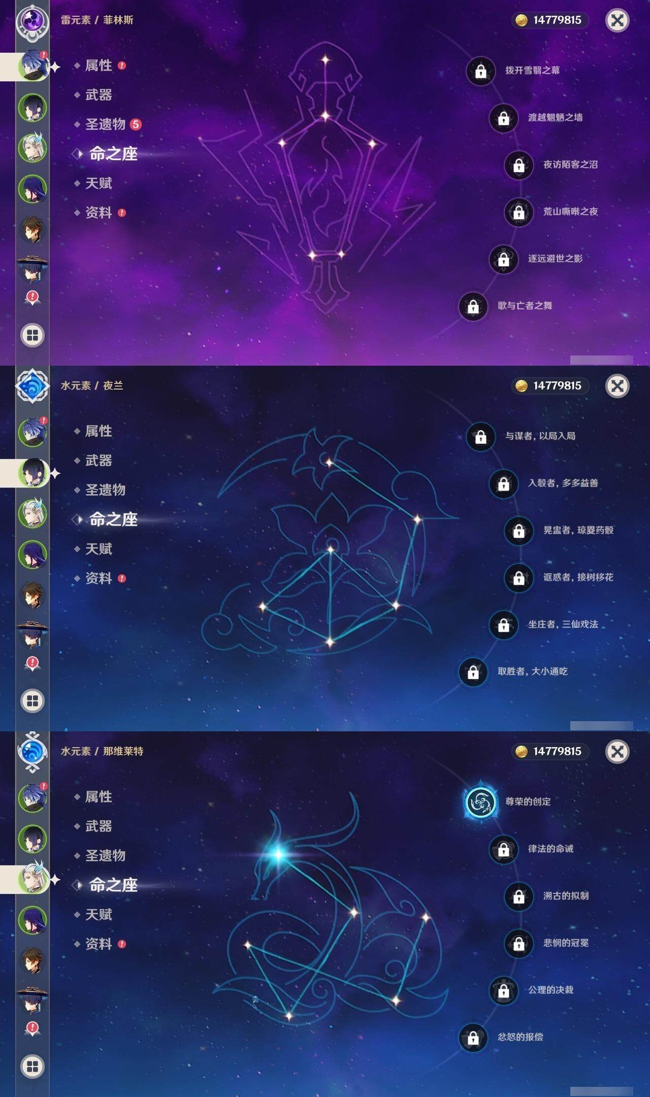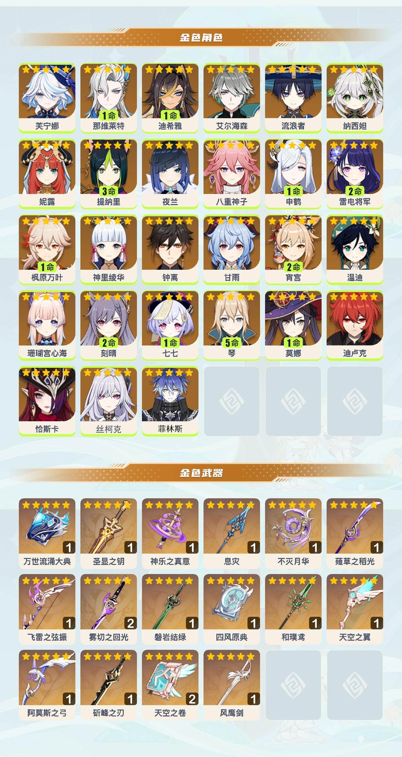 0命芙宁娜,1命那维莱特,1命迪希雅,0命艾尔海森,0命流浪者,0命纳西妲,0命妮露,3命提纳里,0命夜兰,0命八重神子,1命申鹤,2命雷电将军,1命枫原万叶,0命神里绫华,0命钟离,0命甘雨,2命宵宫,0命温迪,0命珊瑚宫心海,2命刻晴,1命七七,5命琴,1命莫娜,0命迪卢克,0命恰斯卡,0命丝柯克,0命菲林斯,精1万世流涌大典,精1圣显之钥,精1神乐之真意,精1息灾,精1不灭月华,精1薙草之稻光,精1飞雷之弦振,精2雾切之回光,精1磐岩结绿,精1四风原典,精1和璞鸢,精1天空之翼,精1阿莫斯之弓,精1斫峰之刃,精2天空之卷,精1风鹰剑