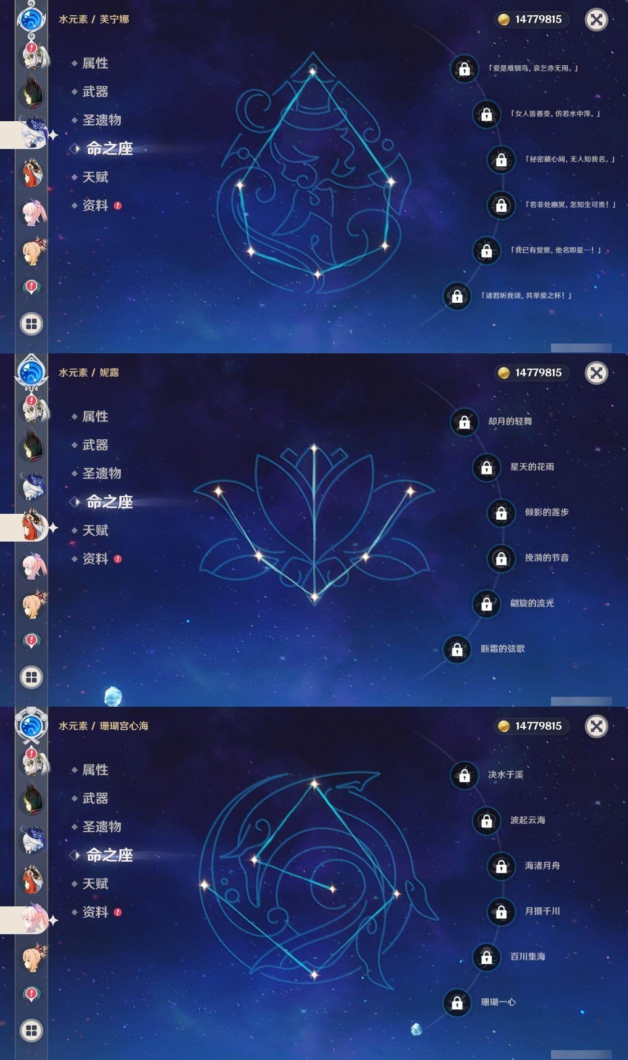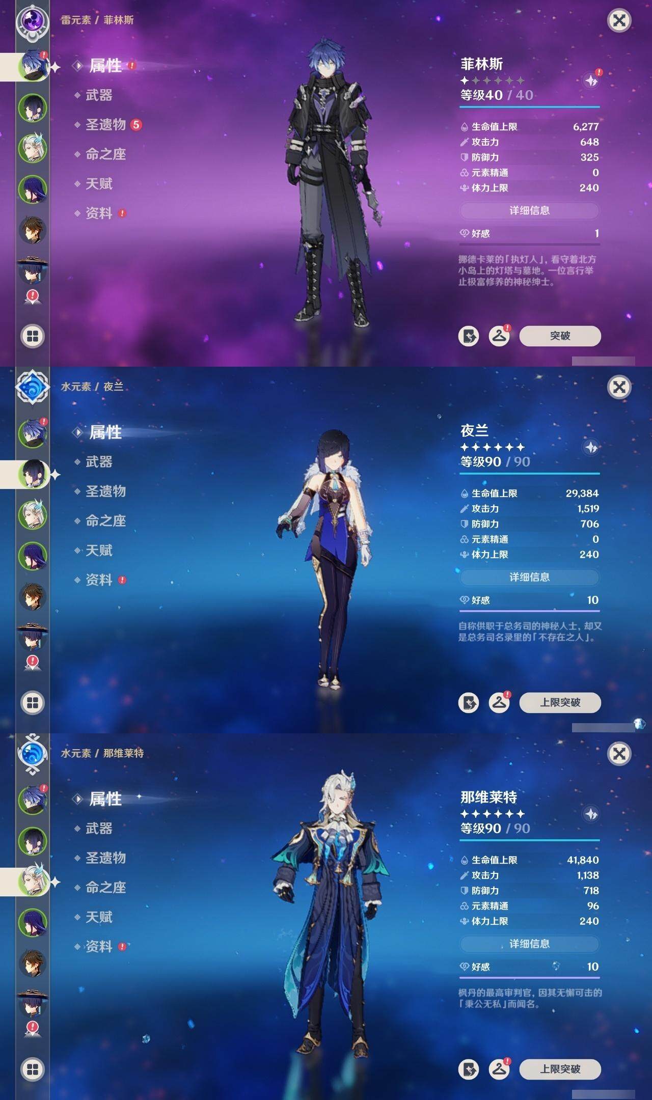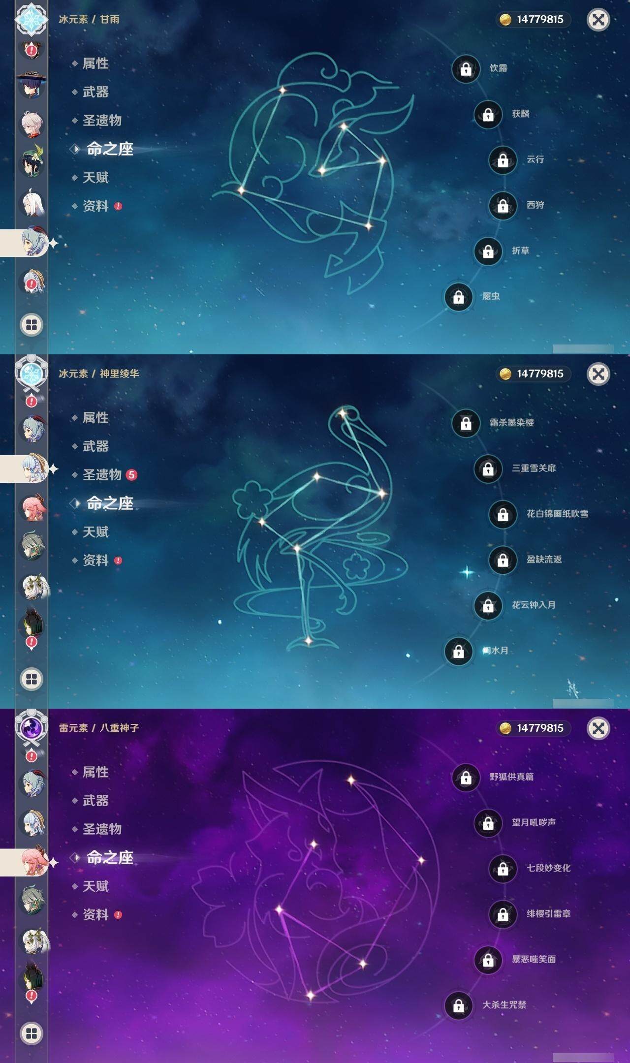0命芙宁娜,1命那维莱特,1命迪希雅,0命艾尔海森,0命流浪者,0命纳西妲,0命妮露,3命提纳里,0命夜兰,0命八重神子,1命申鹤,2命雷电将军,1命枫原万叶,0命神里绫华,0命钟离,0命甘雨,2命宵宫,0命温迪,0命珊瑚宫心海,2命刻晴,1命七七,5命琴,1命莫娜,0命迪卢克,0命恰斯卡,0命丝柯克,0命菲林斯,精1万世流涌大典,精1圣显之钥,精1神乐之真意,精1息灾,精1不灭月华,精1薙草之稻光,精1飞雷之弦振,精2雾切之回光,精1磐岩结绿,精1四风原典,精1和璞鸢,精1天空之翼,精1阿莫斯之弓,精1斫峰之刃,精2天空之卷,精1风鹰剑