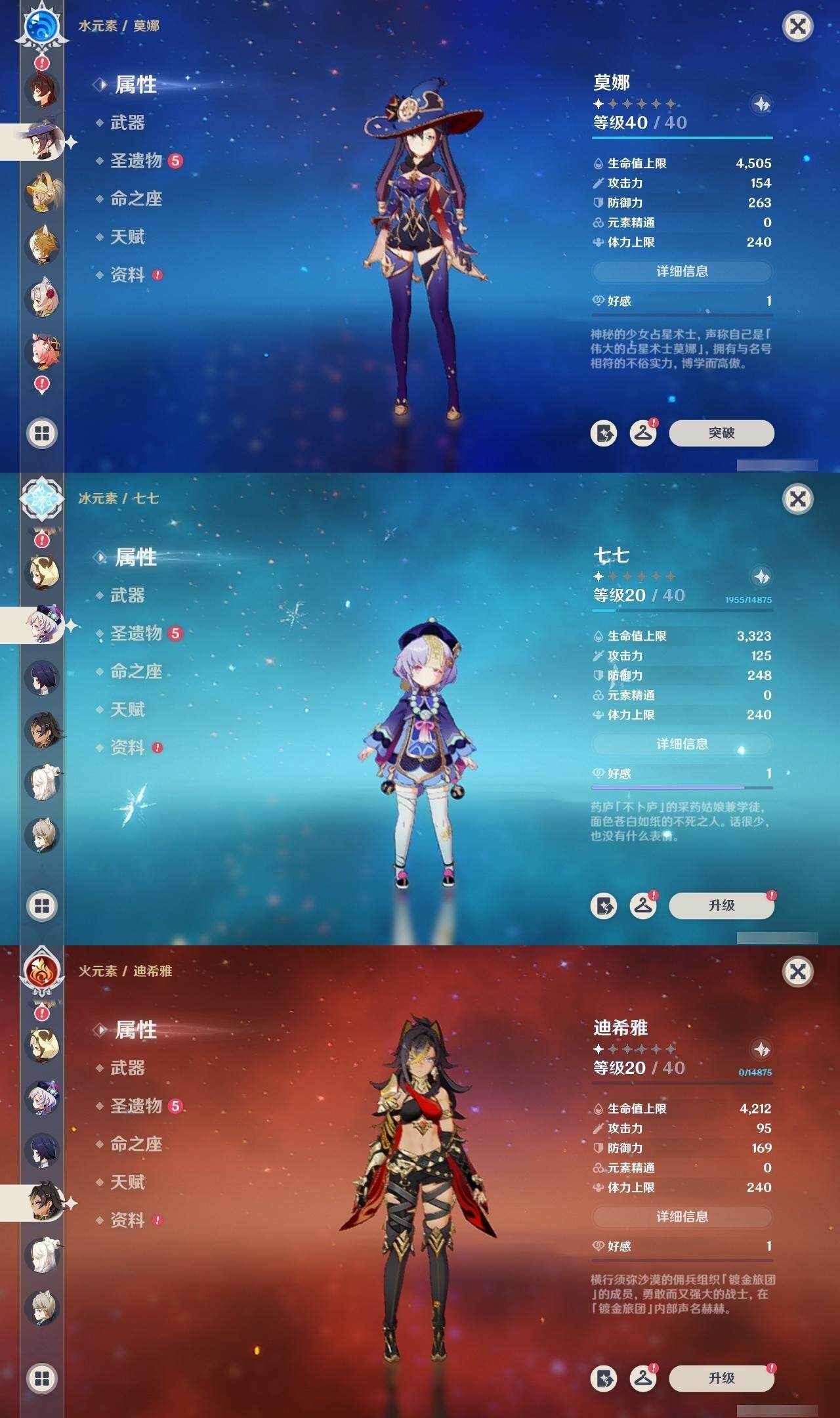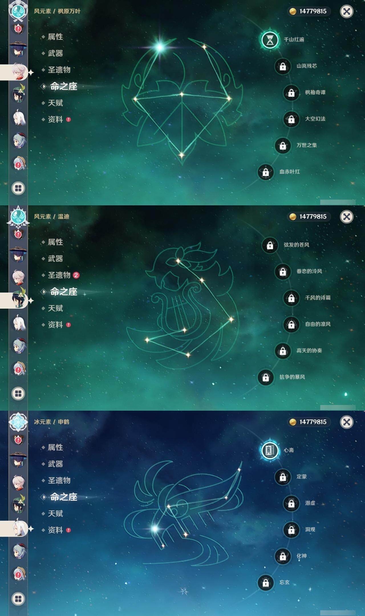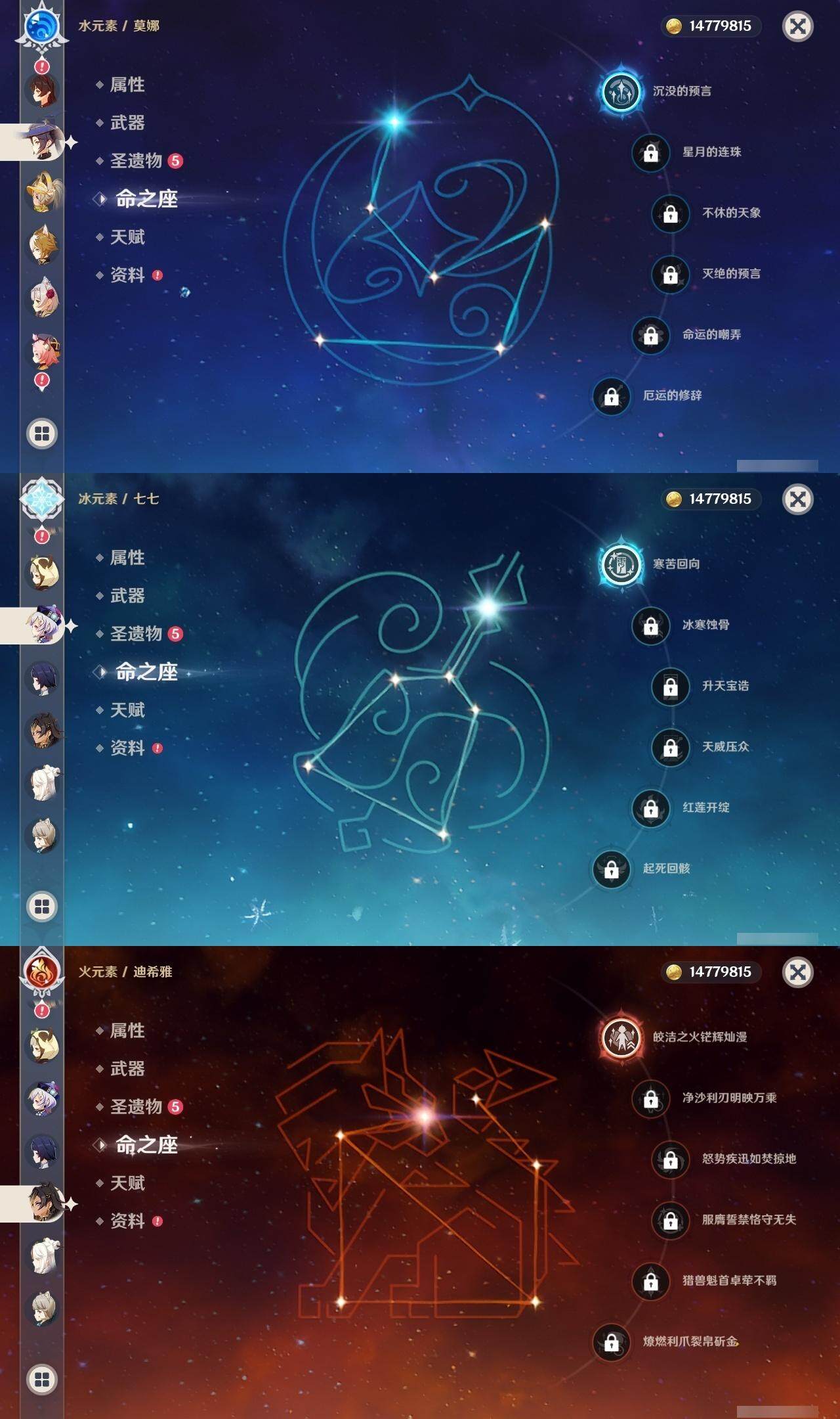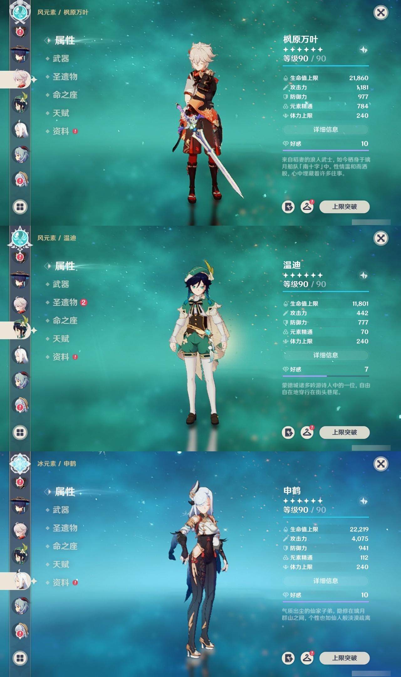 - [15186195]56级/19黄/男主/13个五星角色/3个五星武器 0命阿蕾奇诺,0命林尼,1命迪希雅,0命流浪者,0命纳西妲,0命妮露,0命提纳里,0命枫原万叶,0命神里绫华,0命甘雨,1命刻晴,1命七七,0命莫娜,精1苍古自由之誓,精1天空之刃,精1风鹰剑