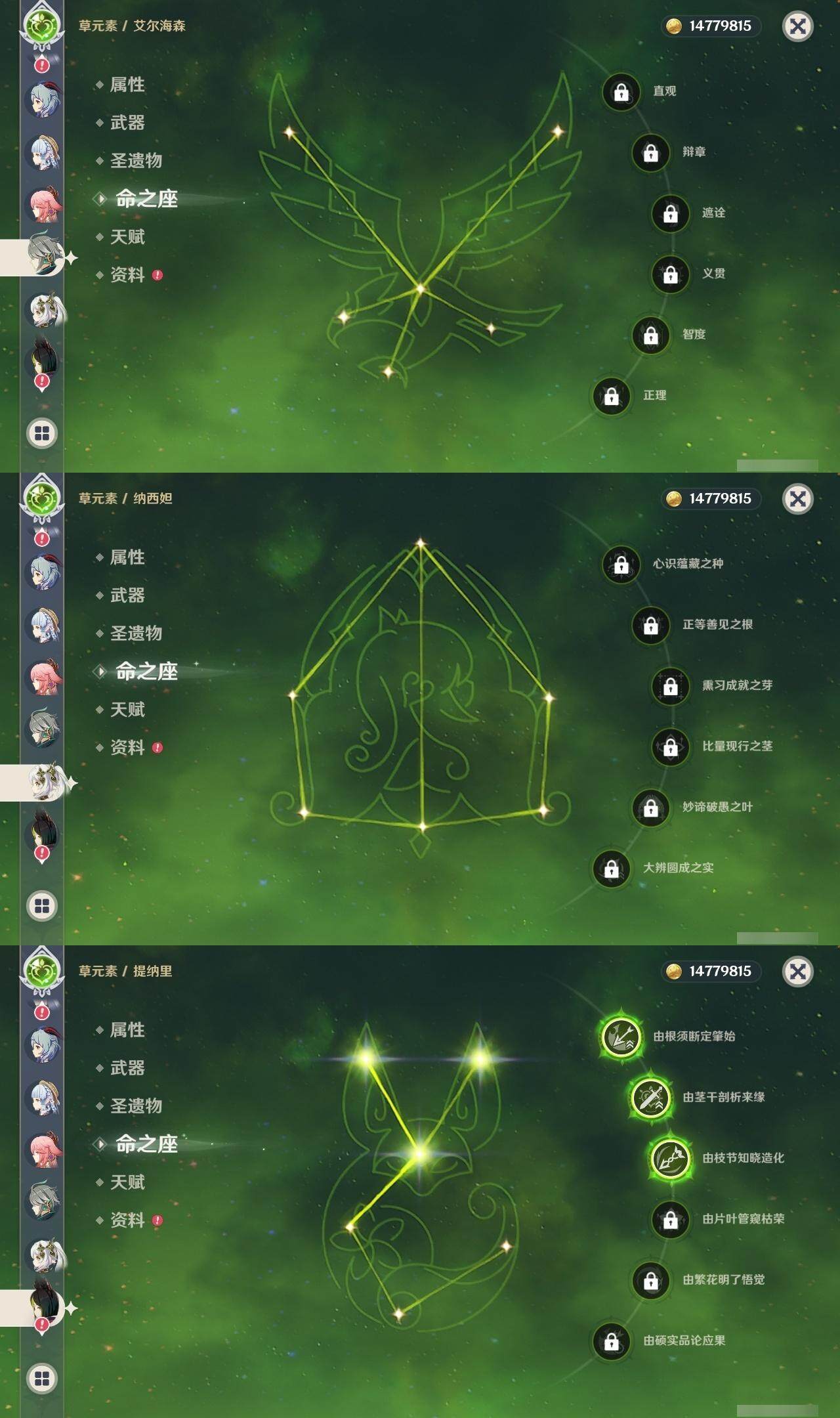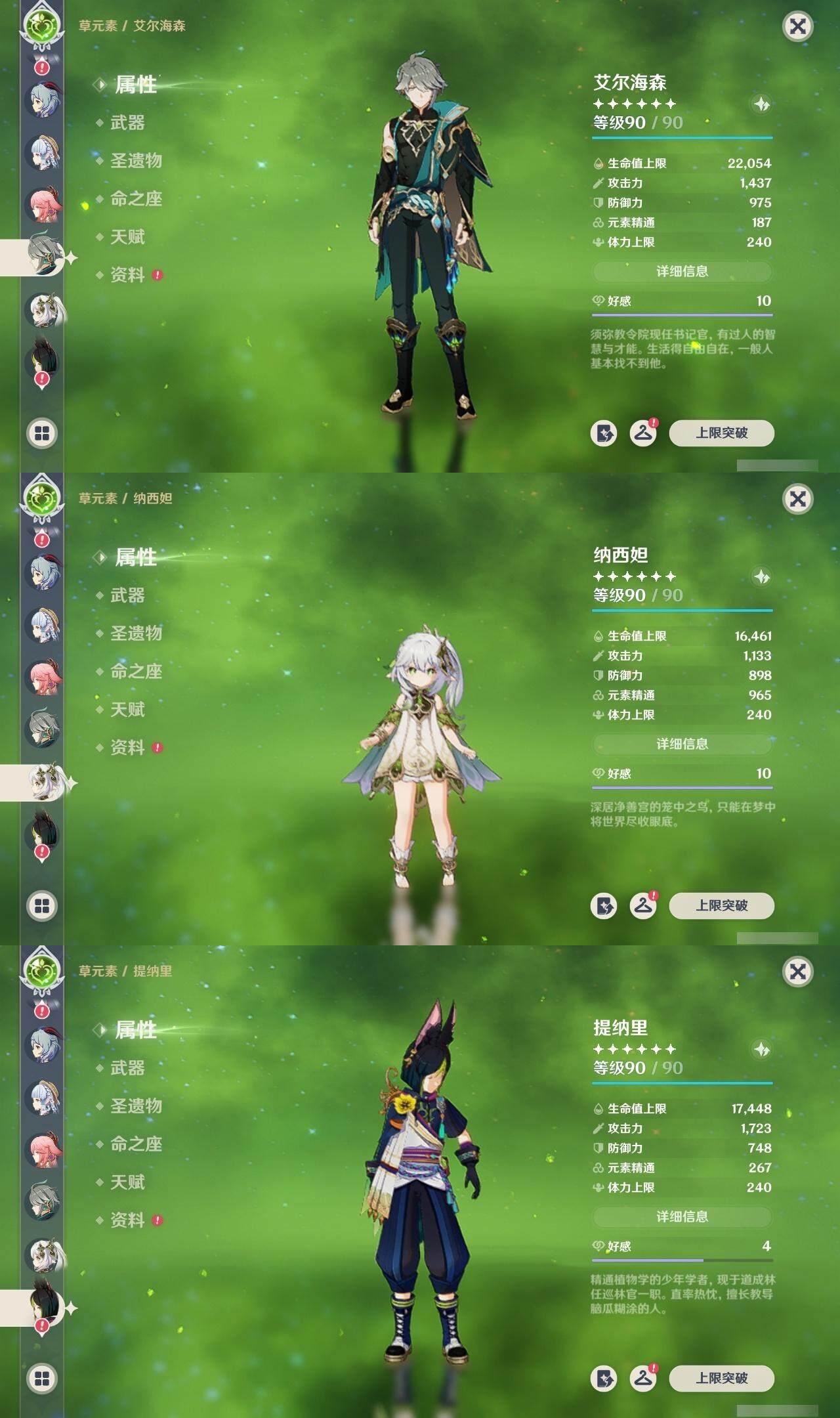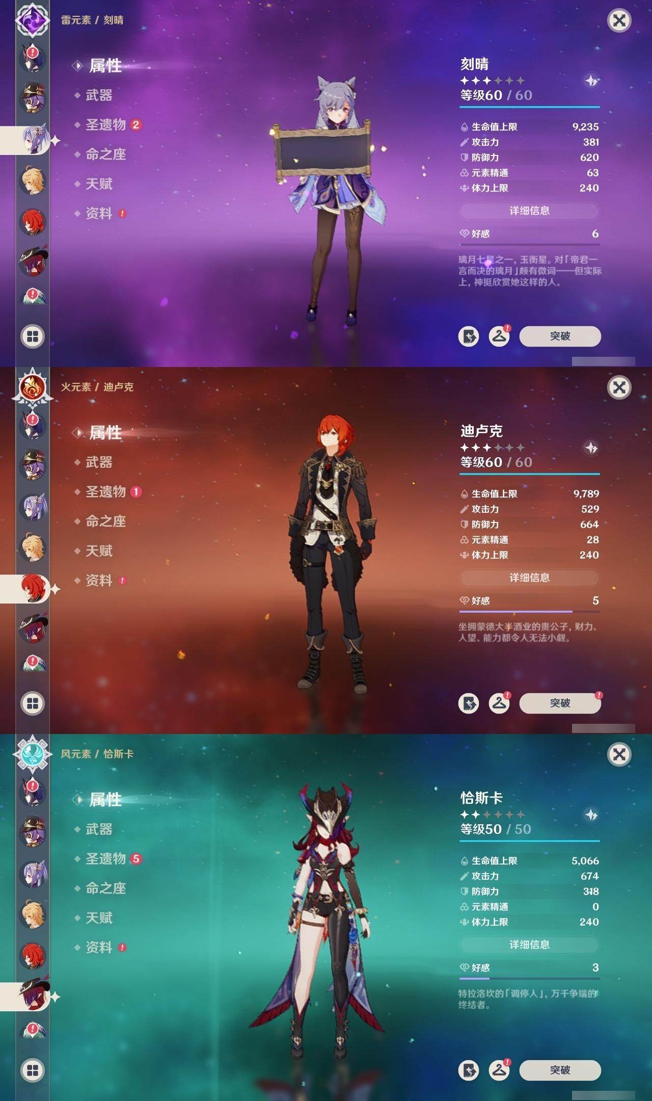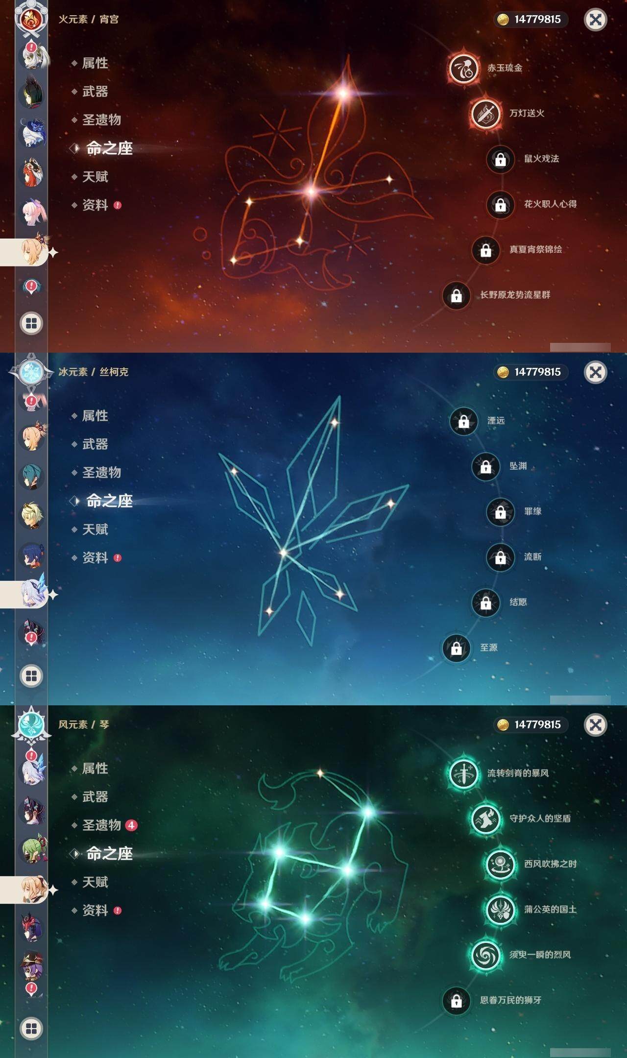 - [15186195]56级/19黄/男主/13个五星角色/3个五星武器 0命阿蕾奇诺,0命林尼,1命迪希雅,0命流浪者,0命纳西妲,0命妮露,0命提纳里,0命枫原万叶,0命神里绫华,0命甘雨,1命刻晴,1命七七,0命莫娜,精1苍古自由之誓,精1天空之刃,精1风鹰剑