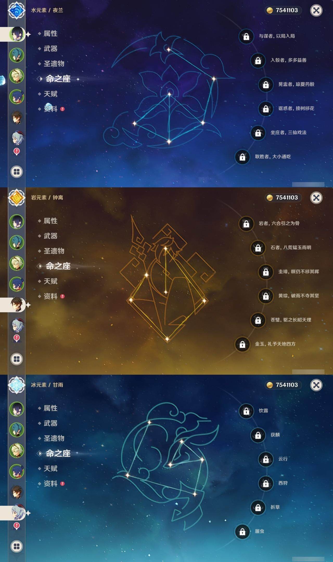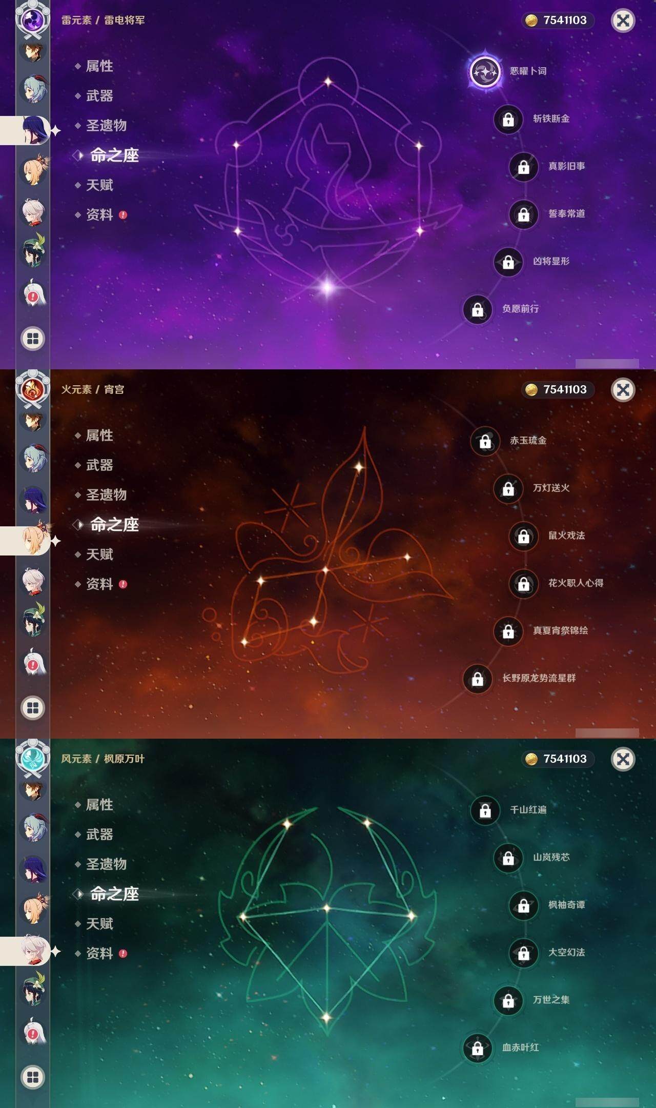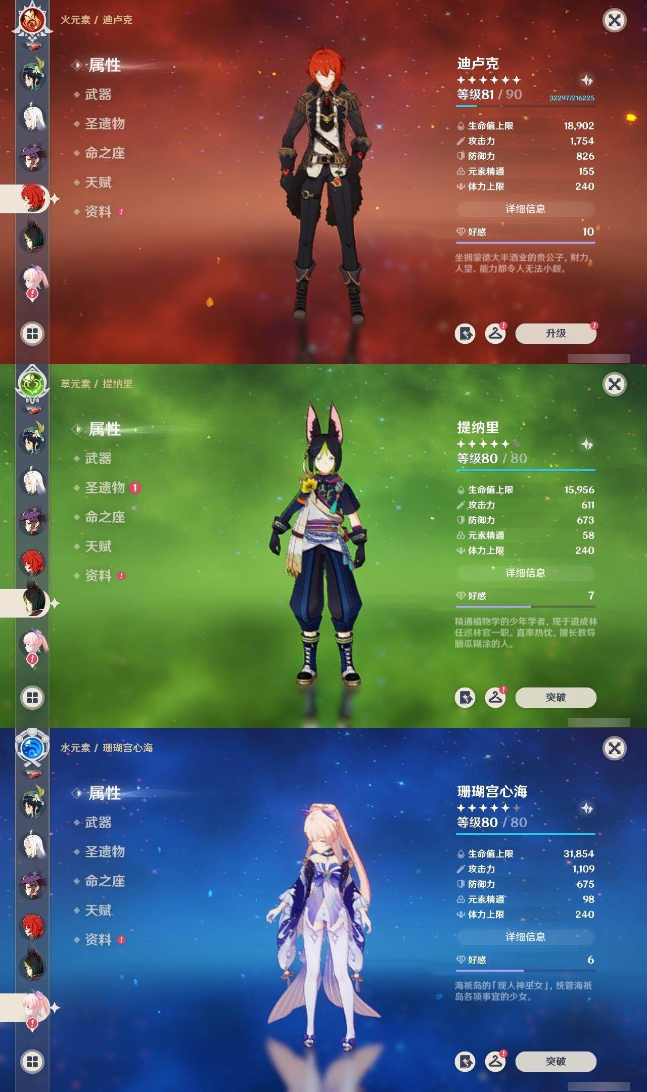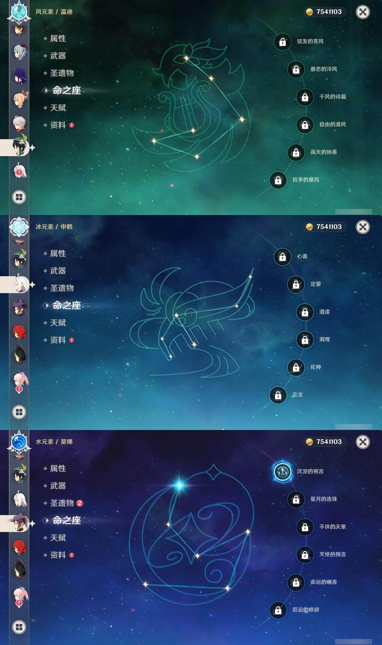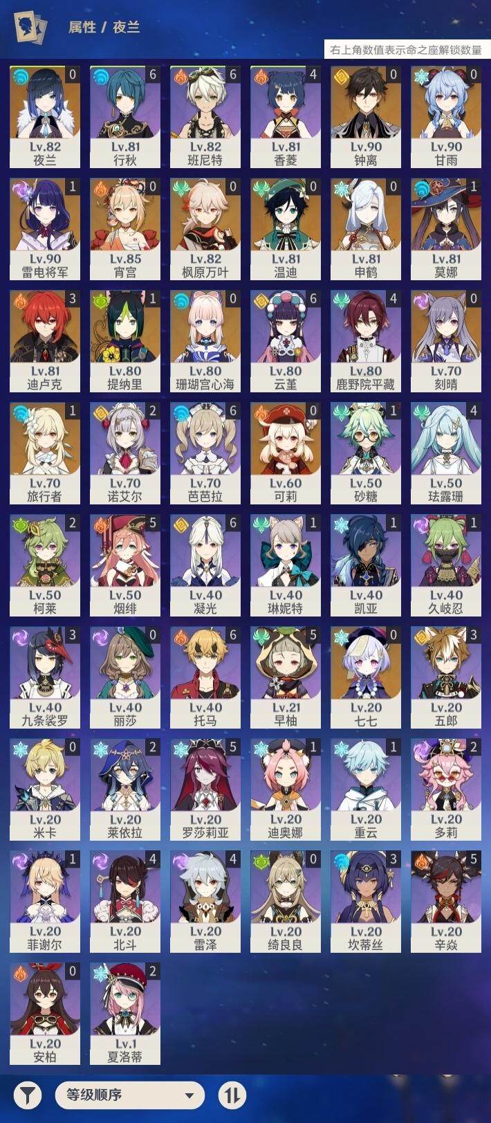 1命提纳里,0命夜兰,0命申鹤,1命雷电将军,0命枫原万叶,0命钟离,0命甘雨,0命宵宫,0命温迪,0命可莉,0命珊瑚宫心海,0命刻晴,0命七七,1命莫娜,3命迪卢克,精1息灾,精1天空之脊,精1阿莫斯之弓,精1风鹰剑