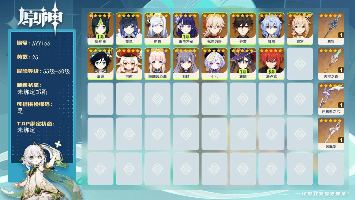 [15191191]58级/25黄/女主/15个五星角色/4个五星武器 1命提纳里,0命夜兰,0命申鹤,1命雷电将军,0命枫原万叶,0命钟离,0命甘雨,0命宵宫,0命温迪,0命可莉,0命珊瑚宫心海,0命刻晴,0命七七,1命莫娜,3命迪卢克,精1息灾,精1天空之脊,精1阿莫斯之弓,精1风鹰剑