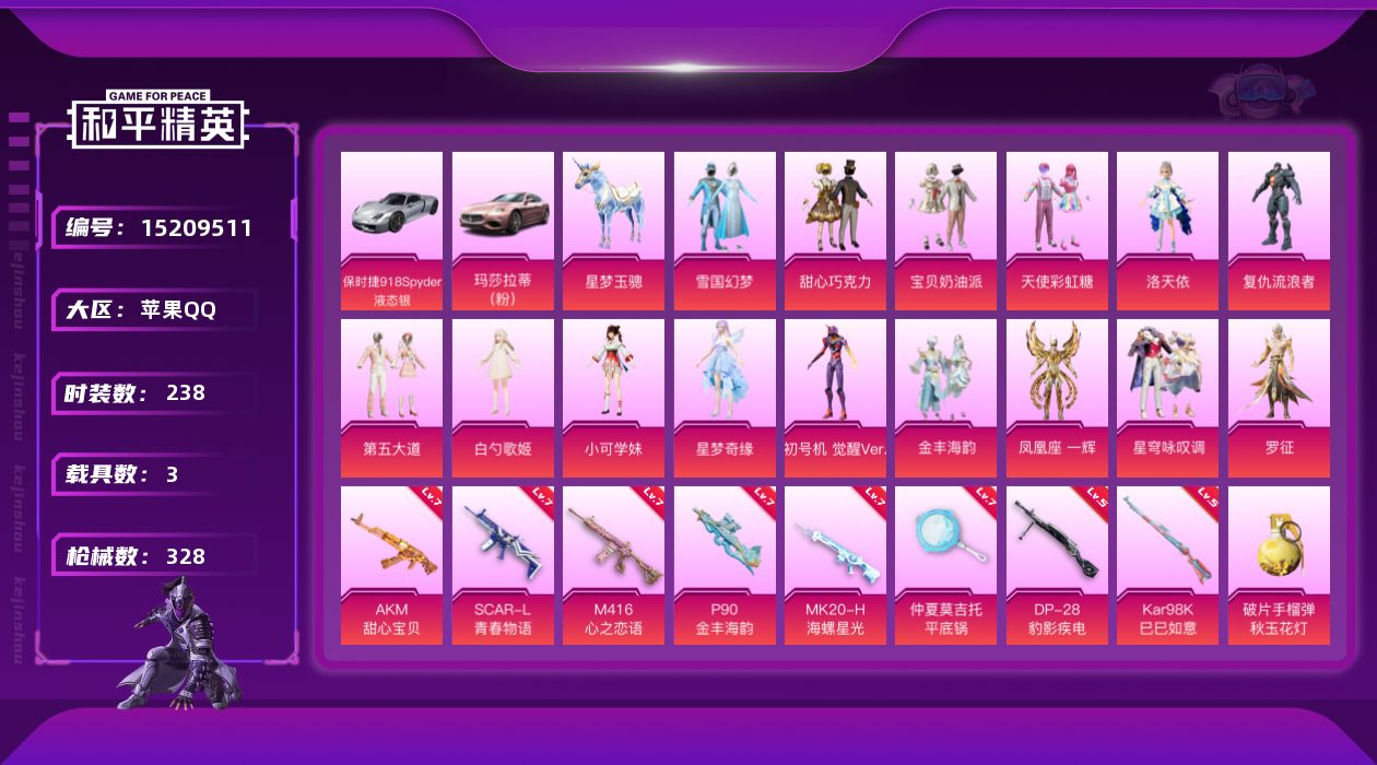 [15209511]【店主推荐捡漏号!可直接换绑】/素材身法号/扭蛋碎片874 苹果 手Q-15粉装-9特效枪-3载具-4粉色飞行器-10.8w热力值-17王牌印记-238套装-328枪皮【热门品类】:粉装-雪国幻梦,套装-SS1特训,套装-龟仙人,套装-粉红小猪,角色-Mark.06【粉色载具】:玛莎拉蒂Ghibli(粉),保时捷918 Spyder(液态银),星梦玉骢【粉色套装】:粉装-甜心巧克力,粉装-宝贝奶油派,粉装-天使彩虹糖,粉装-雪国幻梦,角色-洛天依,角色-复仇流浪者,粉装-第五大道,角色-白勺歌姬,角色-小可学妹,角色-星梦奇缘,角色-初号机 觉醒Ver.,粉装-金丰海韵,角色-凤凰座 一辉,粉装-星穹咏叹调,角色-罗征【粉色枪皮等级】:AKM-甜心宝贝(七级),SCAR-L-青春物语(七级),M416-心之恋语(七级),P90-金丰海韵(七级),Kar98K-巳巳如意(五级),MK20-H-海螺星光(七级),DP-28-豹影疾电(五级),平底锅-仲夏莫吉托(七级)【粉色飞行器】:庄周梦蝶飞行器,深渊漩涡飞行器,灵猫魔法师飞行器,飞天猪飞行器