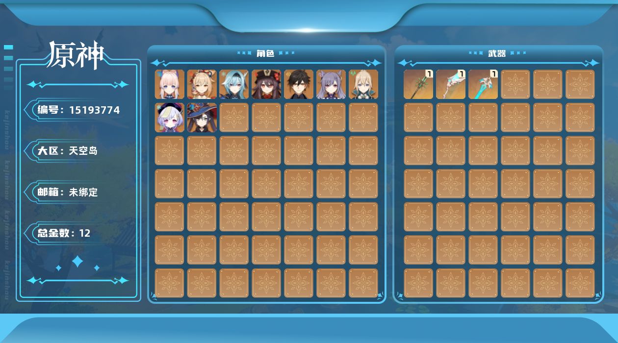 [15193774]56级/12黄/女主/9个五星角色/3个五星武器 0命优菈,0命钟离,0命胡桃,0命宵宫,0命珊瑚宫心海,0命刻晴,0命七七,0命琴,0命莫娜,精1和璞鸢,精1天空之翼,精1天空之刃
