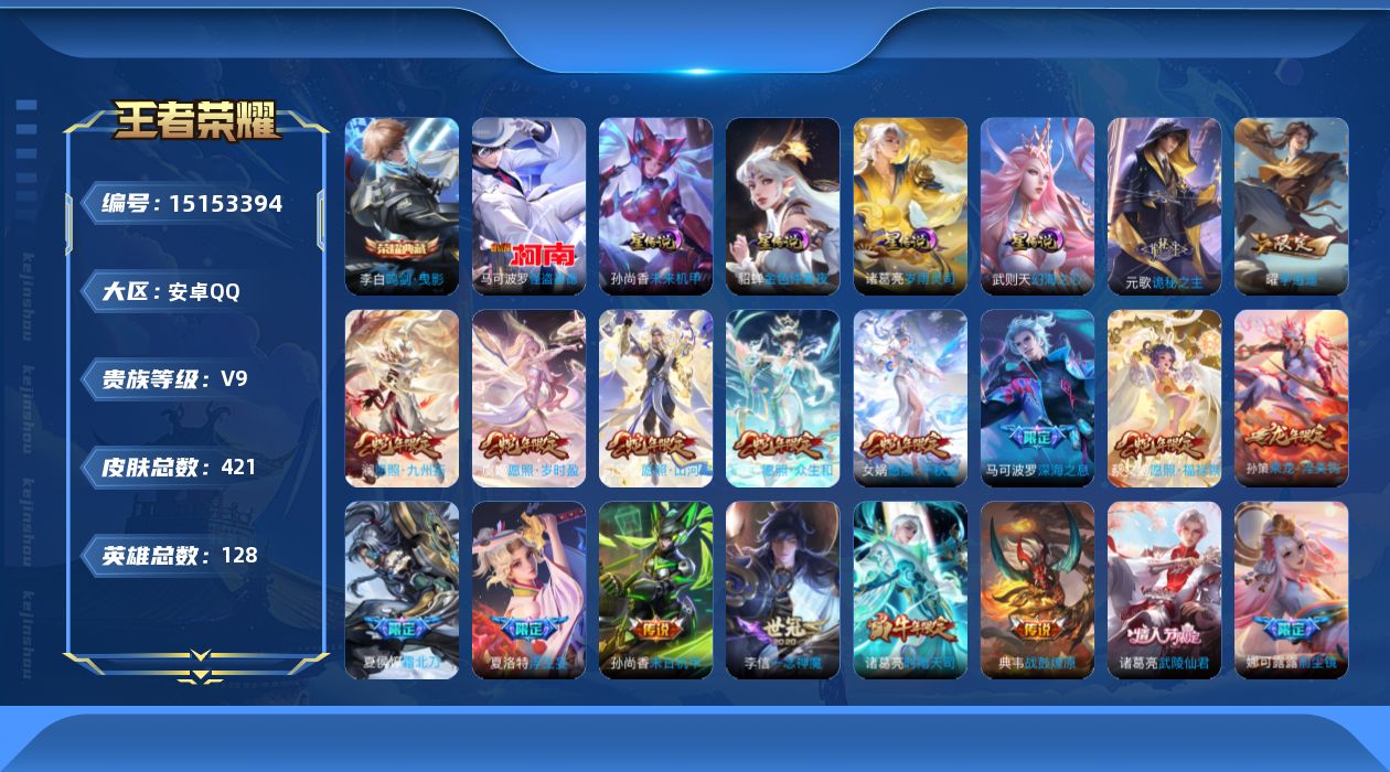 [15153394]【店主推荐捡漏号!可直接换绑】安卓Q-V9-最强王者段位-128英雄-421皮肤-1典藏-1珍品传说-4星元-40传说-128史诗