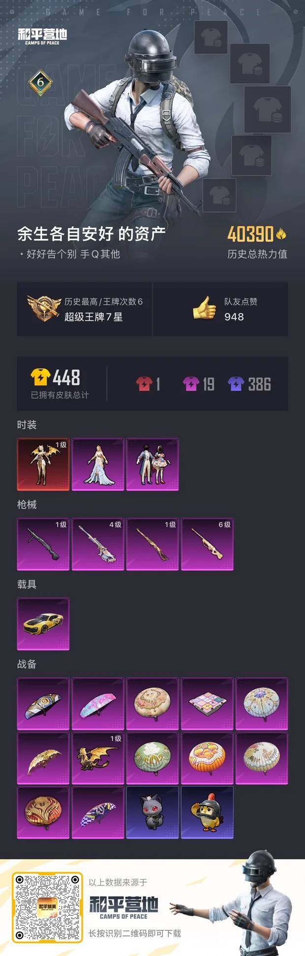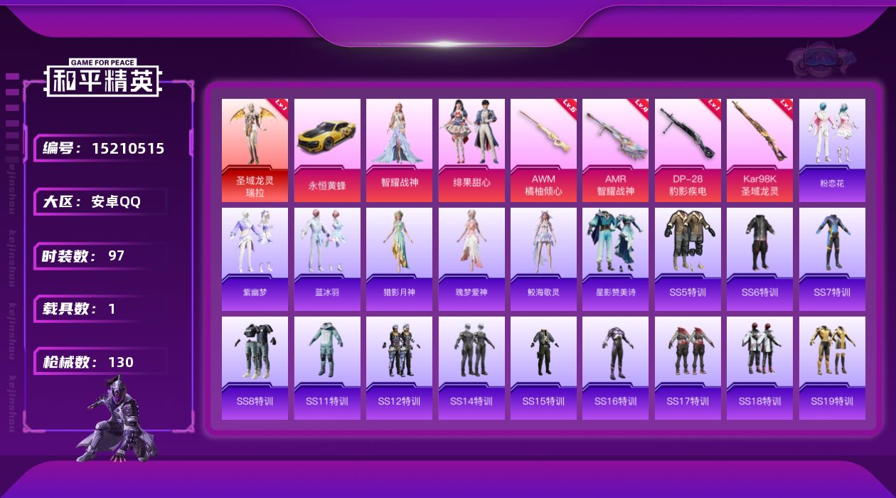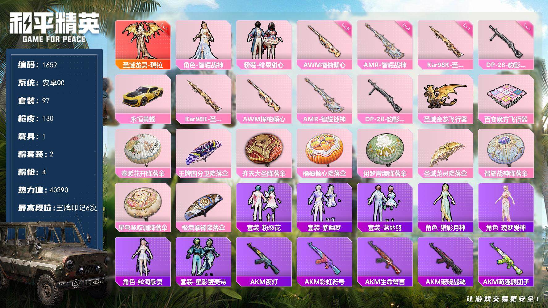 [15210515]【1659】安卓 手Q-1神装-2粉装-4特效枪-1载具-2粉色飞行器-40390热力值-6王牌印记-97套装-130枪皮