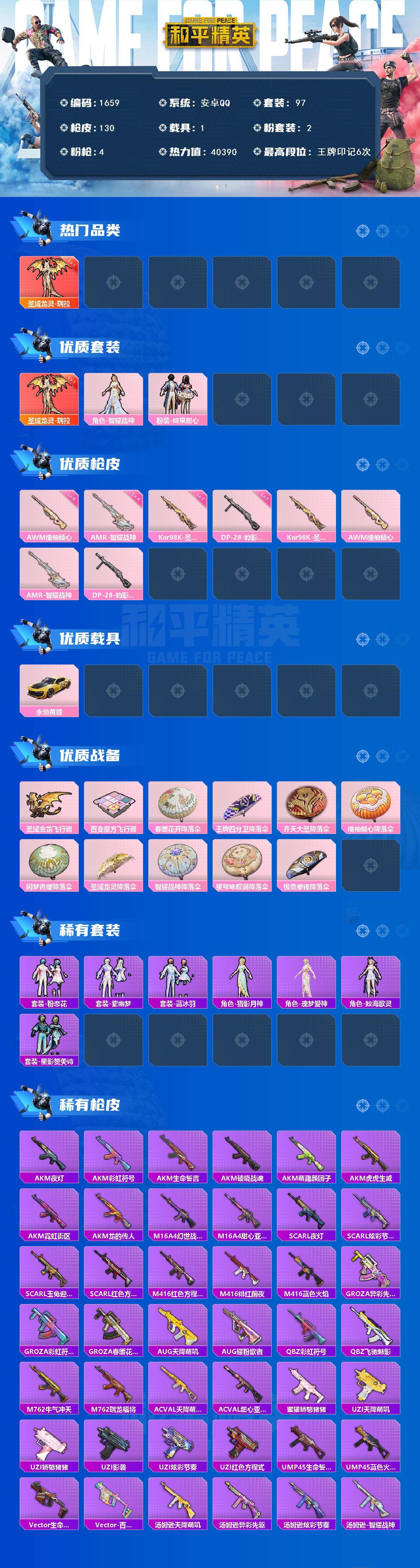 [15210515]【1659】安卓 手Q-1神装-2粉装-4特效枪-1载具-2粉色飞行器-40390热力值-6王牌印记-97套装-130枪皮 【红色神装等级】:圣域龙灵-瑞拉(一级) 【红色角色神装】:圣域龙灵-瑞拉 【粉色套装】:角色-智耀战神,粉装-绯果甜心 【粉色枪皮等级】:Kar98K-圣域龙灵(一级),AWM-橘柚倾心(六级),AMR-智耀战神(四级),DP-28-豹影疾电(一级) 【粉色载具】:永恒黄蜂 【粉色枪皮】:Kar98K-圣域龙灵,AWM-橘柚倾心,AMR-智耀战神,DP-28-豹影疾电 【粉色飞行器】:圣域金龙飞行器,百变魔方飞行器 【粉色降落伞】:春暖花开降落伞,王牌四分卫降落伞,齐天大圣降落伞,橘柚倾心降落伞,闲梦青缨降落伞,圣域龙灵降落伞,智耀战神降落伞,星穹咏叹调降落伞,极意拳锋降落伞,炫彩糖果降落伞 【稀有套装】:套装-粉恋花,套装-紫幽梦,套装-蓝冰羽,角色-猎影月神,角色-瑰梦爱神,角色-鲛海歌灵,套装-星影赞美诗 【稀有枪皮】:AUG-冰晶雪宝,AKM-夜灯,AKM-彩虹符号,AKM-生命誓言,AKM-破晓战魂,AKM-萌趣颜团子,AKM-虎虎生威,AKM-霓虹街区,AKM-龙的传人,M16A4-幻世战舞者,M16A4-甜心亚梦,SCAR-L-夜灯,SCAR-L-炫彩节奏,SCAR-L-玉兔迎春,SCAR-L-红色方程式,M416-红色方程式,M416-绯红前夜,M416-蓝色火焰,GROZA-异彩先驱,GROZA-彩虹符号,GROZA-春暖花开,AUG-天降萌叽,AUG-耀粉歌者,QBZ-彩虹符号,QBZ-飞驰魅影,M762-牛气冲天,M762-瑞龙福将,AC-VAL-天降萌叽,AC-VAL-甜心亚梦,蜜獾-娇憨猪猪,UZI-天降萌叽,UZI-娇憨猪猪,UZI-影袭,UZI-炫彩节奏,UZI-红色方程式,UMP45-生命誓言,UMP45-蓝色火焰,Vector-生命誓言,Vector-百变魔方,汤姆逊-天降萌叽,汤姆逊-异彩先驱,汤姆逊-炫彩节奏,汤姆逊-智耀战神,MP5K-异彩先驱,P90-飞驰魅影,燃点复合弓-幻海仙踪,Kar98K-彩虹符号,Kar98K-欢乐麻酱,Kar98K-红色方程式,Kar98K-飞驰魅影,Kar98K-星穹咏叹调,M24-幻彩电音,SKS-夜灯,SKS-炫彩节奏,SKS-圣域龙灵,Mini14-异彩先驱,Mi