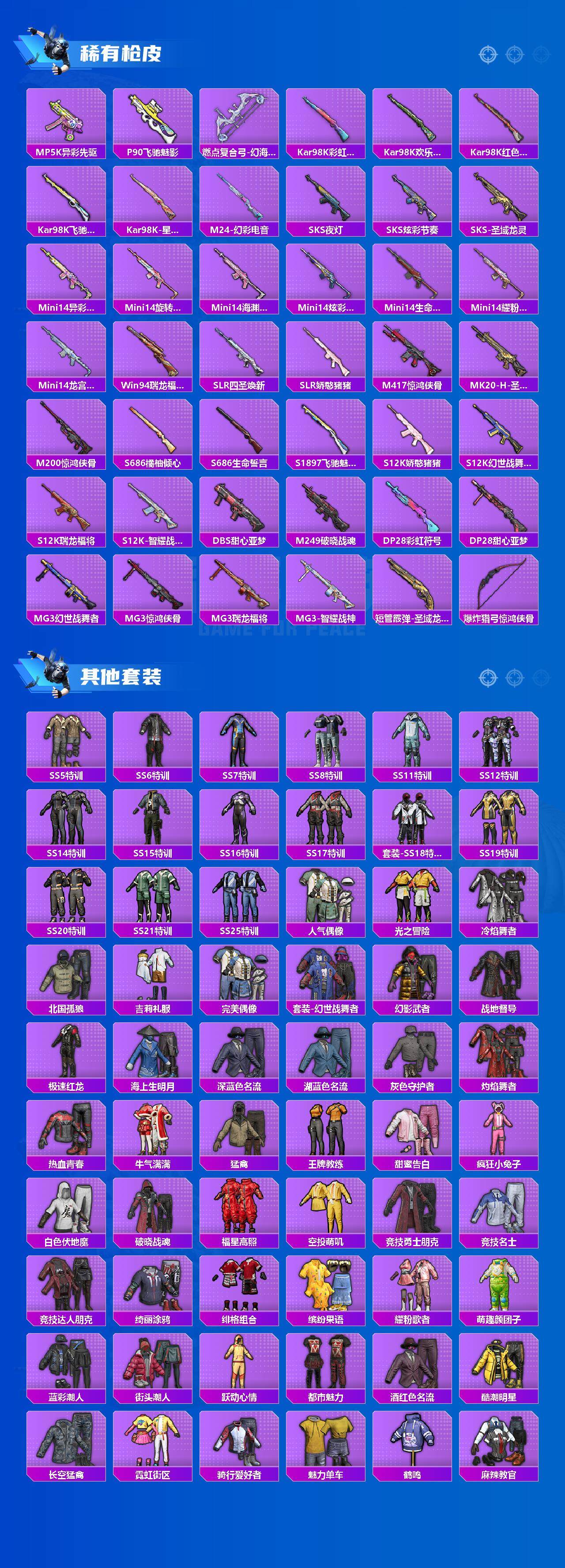 【稀有枪皮】:AUG-冰晶雪宝,AKM-夜灯,AKM-彩虹符号,AKM-生命誓言,AKM-破晓战魂,AKM-萌趣颜团子,AKM-虎虎生威,AKM-霓虹街区,AKM-龙的传人,M16A4-幻世战舞者,M16A4-甜心亚梦,SCAR-L-夜灯,SCAR-L-炫彩节奏,SCAR-L-玉兔迎春,SCAR-L-红色方程式,M416-红色方程式,M416-绯红前夜,M416-蓝色火焰,GROZA-异彩先驱,GROZA-彩虹符号,GROZA-春暖花开,AUG-天降萌叽,AUG-耀粉歌者,QBZ-彩虹符号,QBZ-飞驰魅影,M762-牛气冲天,M762-瑞龙福将,AC-VAL-天降萌叽,AC-VAL-甜心亚梦,蜜獾-娇憨猪猪,UZI-天降萌叽,UZI-娇憨猪猪,UZI-影袭,UZI-炫彩节奏,UZI-红色方程式,UMP45-生命誓言,UMP45-蓝色火焰,Vector-生命誓言,Vector-百变魔方,汤姆逊-天降萌叽,汤姆逊-异彩先驱,汤姆逊-炫彩节奏,汤姆逊-智耀战神,MP5K-异彩先驱,P90-飞驰魅影,燃点复合弓-幻海仙踪,Kar98K-彩虹符号,Kar98K-欢乐麻酱,Kar98K-红色方程式,Kar98K-飞驰魅影,Kar98K-星穹咏叹调,M24-幻彩电音,SKS-夜灯,SKS-炫彩节奏,SKS-圣域龙灵,Mini14-异彩先驱,Mi