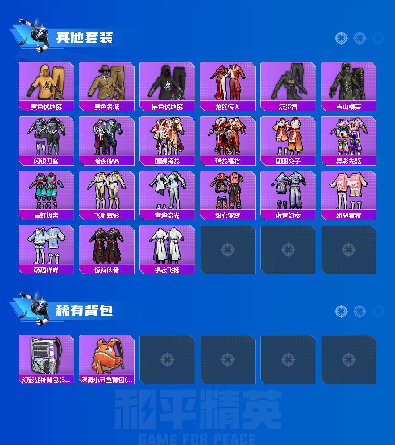 【稀有套装】:套装-粉恋花,套装-紫幽梦,套装-蓝冰羽,角色-猎影月神,角色-瑰梦爱神,角色-鲛海歌灵,套装-星影赞美诗