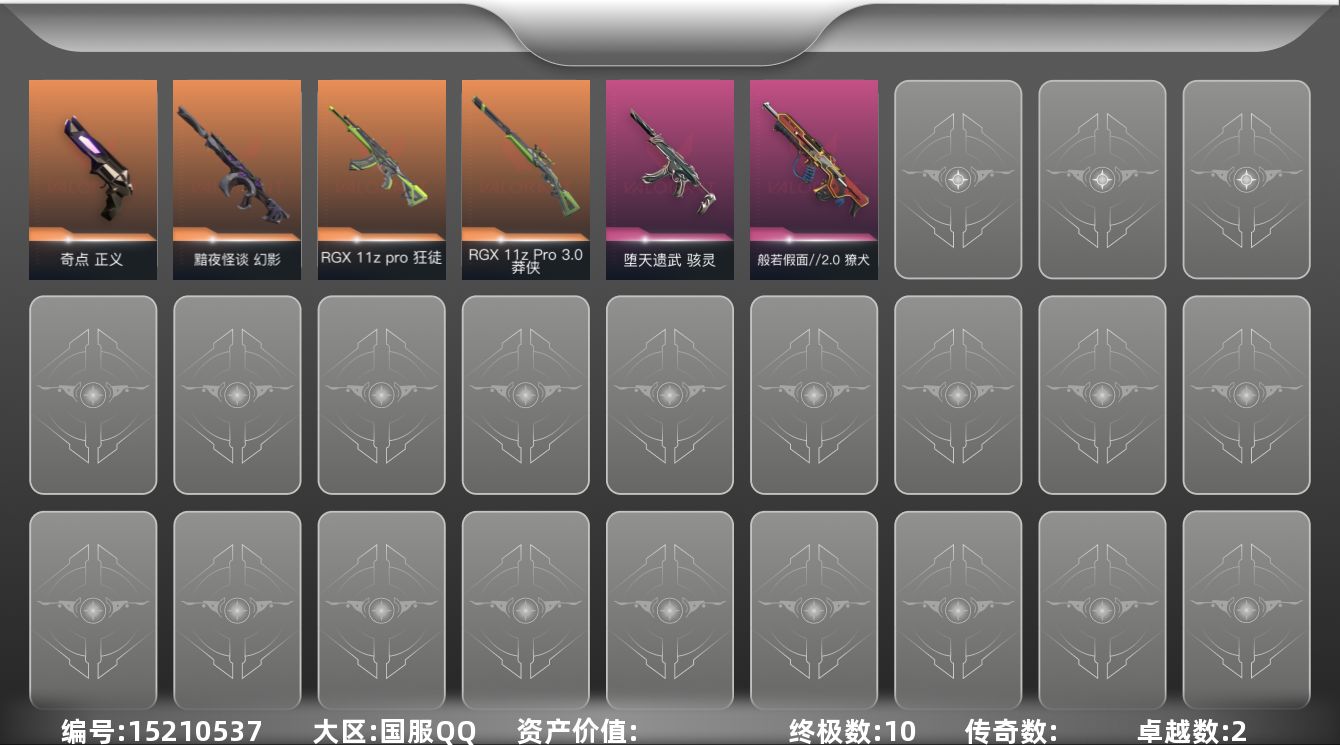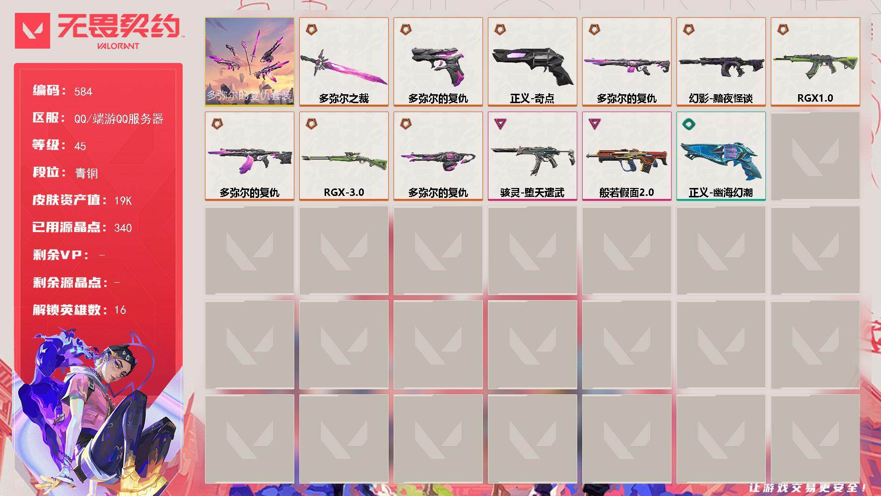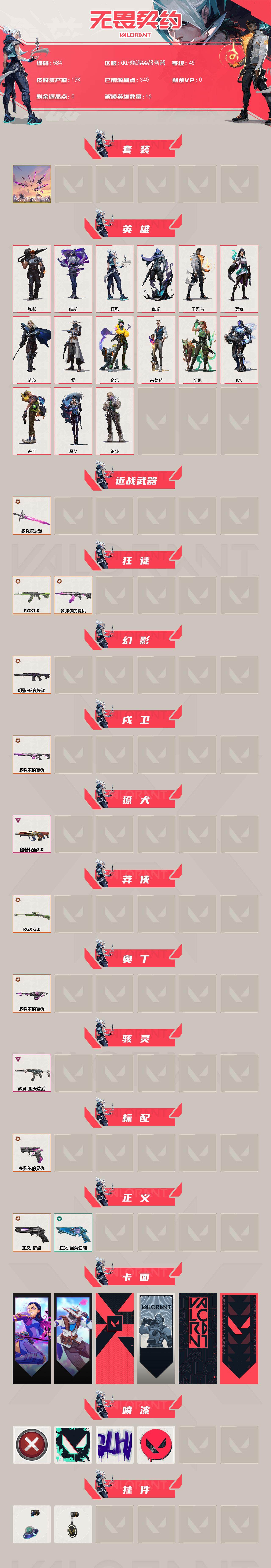 [15210537]【套装】:多弥尔的复仇套装 【英雄】:炼狱,维斯,捷风,幽影,不死鸟,贤者,猎枭,零,奇乐,尚勃勒,斯凯,K/O,盖可,黑梦,钢锁 【近战武器】:近战武器-多弥尔之裁 【狂徒】:狂徒-RGX 11z Pro,狂徒-多弥尔的复仇 【幻影】:幻影-黯夜怪谈 【戍卫】:戍卫-多弥尔的复仇 【獠犬】:獠犬-般若假面//2.0 【莽侠】:莽侠-RGX 11z Pro//3.0 【奥丁】:奥丁-多弥尔的复仇 【骇灵】:骇灵-堕天遗武 【标配】:标配-多弥尔的复仇 【正义】:正义-奇点,正义-幽海幻潮 【卡面】:无畏契约GO!第一卷:芮娜 卡面,无畏契约GO!第一卷:零 卡面,代号红色 卡面,新兵报到 卡面,V契约 卡面,无畏契约 卡面 【喷漆】:买装还是存钱 喷漆,胜利属于无畏契约 喷漆,GLHF 喷漆,无畏契约 喷漆 【挂饰】:天外飞客 挂饰,无畏契约 纪念币 挂饰