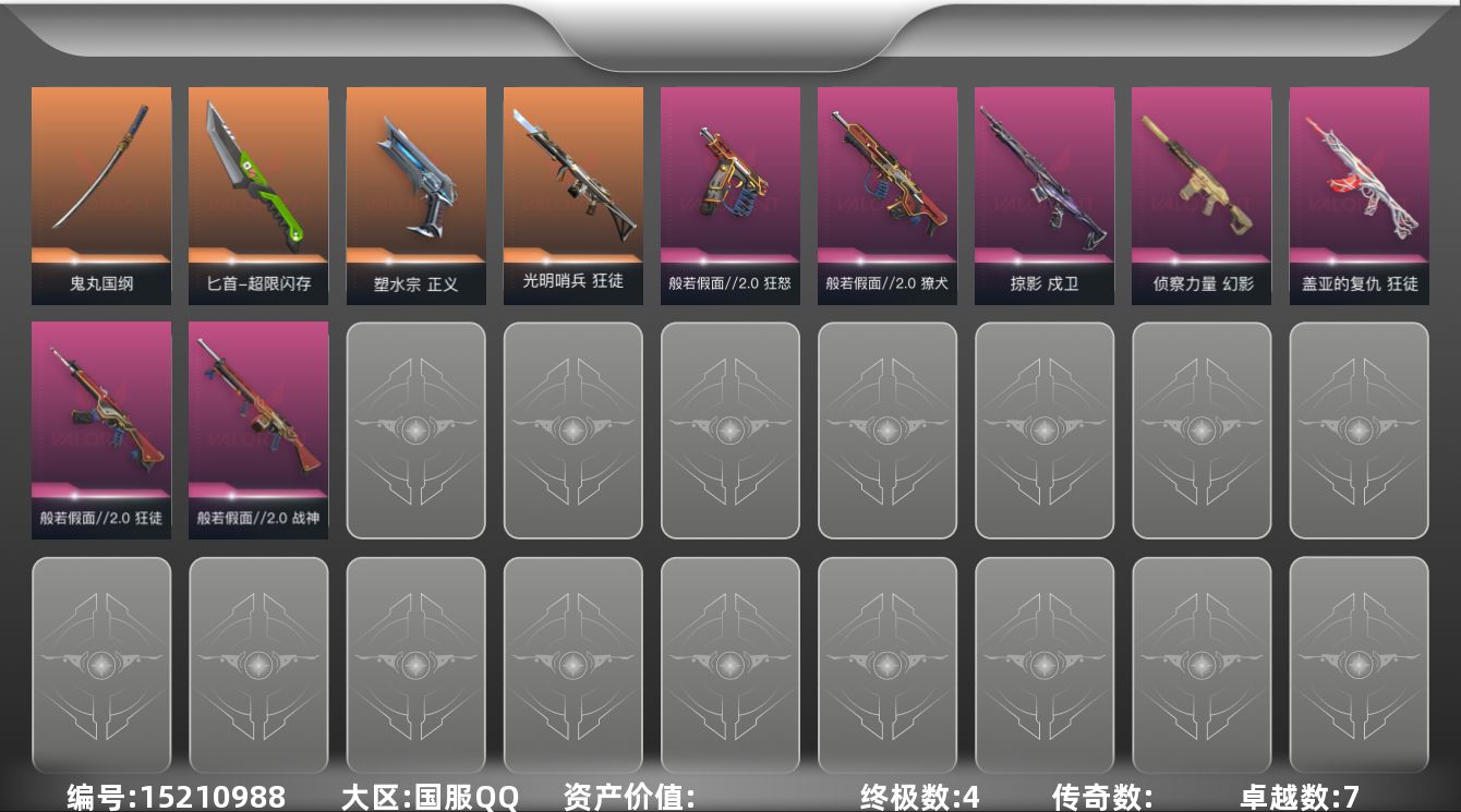 [15210988]【套装】:般若假面//2.0套装 【英雄】:炼狱,维斯,钛狐,壹决,铁臂,捷风,雷兹,不死鸟,贤者,猎枭,蝰蛇,零,芮娜,尚勃勒 【近战武器】:近战武器-鬼丸国纲,近战武器-超限闪存 匕首 【狂徒】:狂徒-光明哨兵,狂徒-般若假面//2.0,狂徒-盖亚的复仇 【幻影】:幻影-侦察力量,幻影-超限闪存 【戍卫】:戍卫-掠影,戍卫-浮光跃金 【獠犬】:獠犬-般若假面//2.0,獠犬-模拟赫兹 【冥驹】:冥驹-模拟赫兹 【莽侠】:莽侠-超限闪存 【战神】:战神-般若假面//2.0,战神-浮光跃金 【雄鹿】:雄鹿-模拟赫兹 【骇灵】:骇灵-浮光跃金 【蜂刺】:蜂刺-超限闪存 【标配】:标配-浮光跃金 【正义】:正义-塑水宗,正义-超限闪存,正义-纳米打击 【鬼魅】:鬼魅-模拟赫兹,鬼魅-星云暗涌 【狂怒】:狂怒-般若假面//2.0 【卡面】:终章:激斗汉堡 卡面,进入射程 卡面,《双城之战》拥抱 卡面,精灵大战 卡面,欢迎来到底城 卡面,南瓜盛典 卡面,唱片的故事 卡面,钢弓与箭弦 卡面,排除故障 卡面,战术桌游 卡面,悠享食光 卡面,修车达人 卡面,模拟赫兹 卡面,浮光跃金 卡面,超限闪存 卡面,维斯工牌 卡面,正义的化身 卡面,零点嗅探设计图 卡面,无畏契约:蝰蛇 卡面,无畏契约GO!第一卷:芮娜 卡面,无畏契约GO!第一卷:零 卡面,《双城之战》金克丝 卡面,势不可挡//K/O 卡面,代号红色 卡面,新兵报到 卡面,V契约 卡面,无畏契约 卡面 【喷漆】:嗨宝南瓜灯 喷漆,嘭! 喷漆,都算到了 喷漆,控场勿近 喷漆,皮蛋呼呼 喷漆,像素星礈 喷漆,图谋不轨的零 喷漆,小丑猫 喷漆,模拟赫兹 喷漆,高丽风情小熊 喷漆,蹲到一个 喷漆,全力集中 喷漆,超限闪存 喷漆,RUA一下 喷漆,熊抱 喷漆,高丽风情小虎 喷漆,记在小本本 喷漆,防弹企鹅 喷漆,高丽风情小蛙 喷漆,致命毒素 喷漆,喜欢哪种毒? 喷漆,买装还是存钱 喷漆,胜利属于无畏契约 喷漆,GLHF 喷漆,无畏契约 喷漆 【挂饰】:终章:猫猫木乃伊 挂饰,悠闲鸡块 挂饰,伞绳 挂饰,《双城之战》小蛋糕 挂饰,第九季//第三幕 纪念币 挂饰,拳击战术熊 挂饰,工具腰带 挂饰,暗藏猫腻 挂饰,高丽风情 挂饰,熔岩灯 挂饰,超限闪存 挂饰,迷你K/O 挂饰,模拟赫兹 挂饰,第九季//第二幕 纪念币 挂饰,Z世代特饮 挂